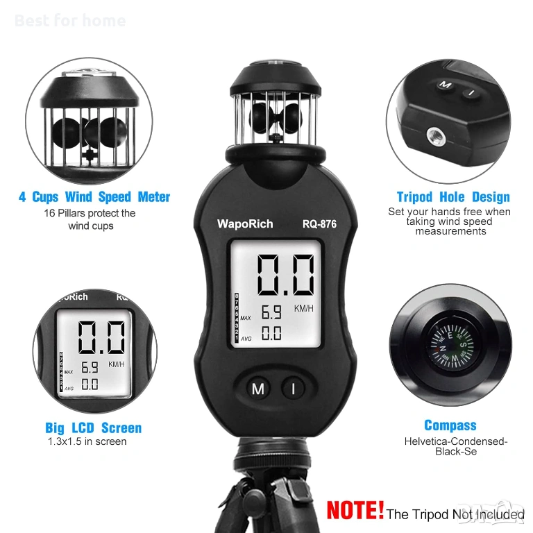 【Голям LCD екран с подсветка】RQ-876 Джобен анемометър с 1,3*1,5 инча голям LCD екран, голям дисплей с числови стойности, които могат да се четат ясно.