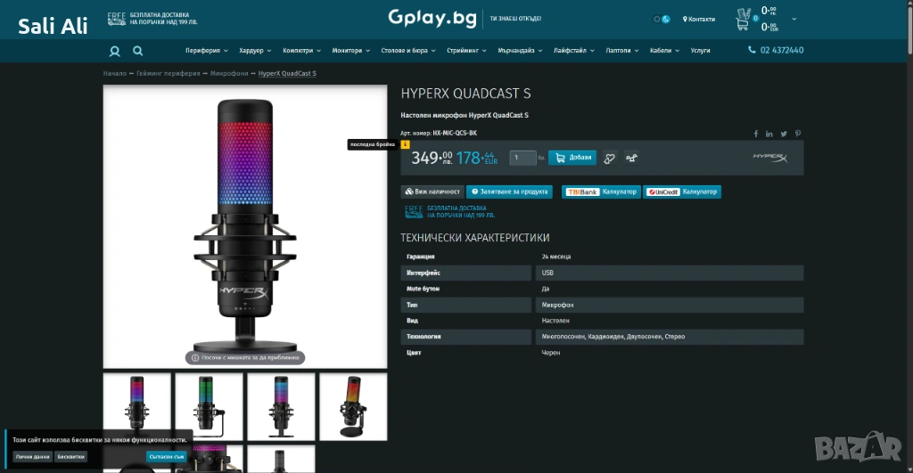 Продавам микрофон HyperX QuadCast S. Устройството е използвано, но е в състояние неразличимо от ново. Няма абсолютно никакви видими следи от употреба, драскотини или износване. Микрофонът е напълно функционален и работи безупречно.