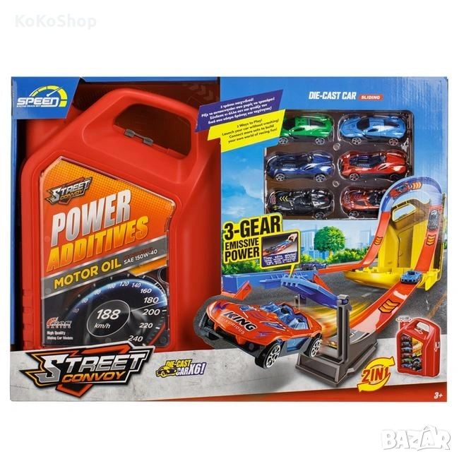 Страхотен комплект,който съдържа писта с изстрелвана,шест колички с раичен дизайн. Всичко това се побира в атрактивно куфарче с форма на туба за моторно масло.