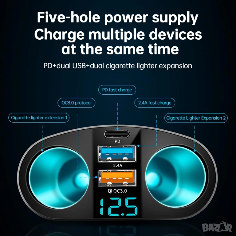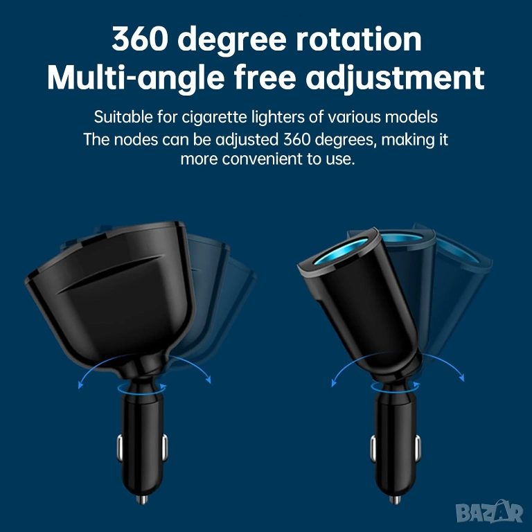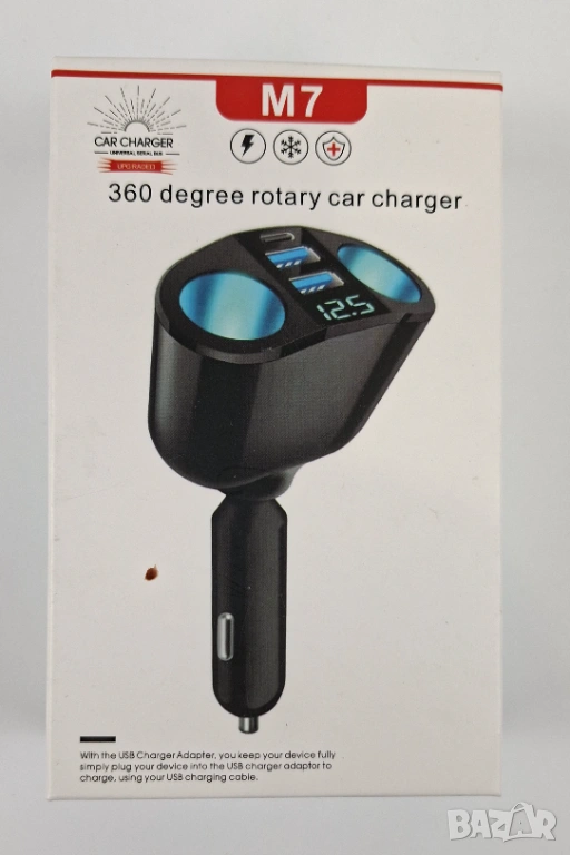 Това зарядно устройство "всичко в едно", разполага с въртяща се на 360° глава, три USB порта за бързо зареждане (включително Type-C) и две допълнителни гнезда за запалка. Вграденият LED дисплей следи напрежението на акумулатора. Идеално е за дълги пътувания и едновременно зареждане на няколко устройства едновременно.