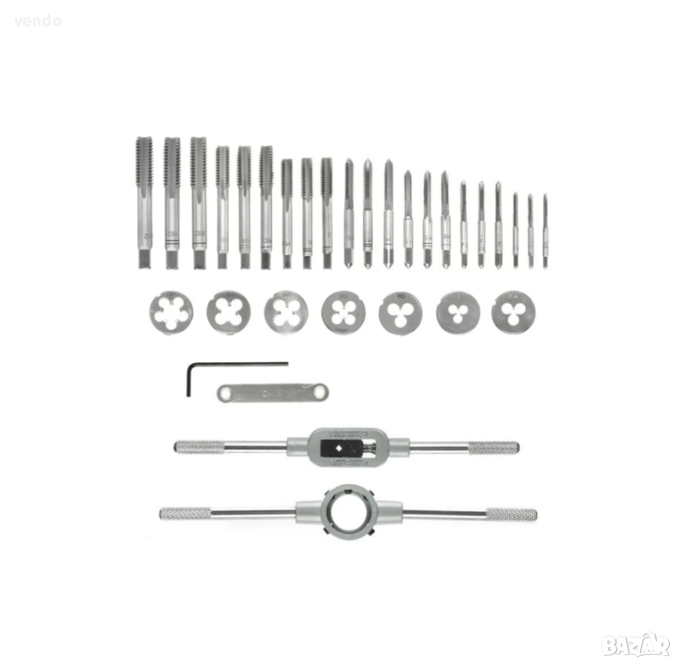 21 бр. метчици (М3/М4/М5/М6/М8/М10/М12) - за всеки размер: 1 бр. за грубо нарезване, 1 бр. за средно нарязване, 1 бр. за фино нарязване / 7 бр. плашки (М3/М4/М5/М6/М8/М10/М12) / 1 върток / 1 бр. държач за плашки / 1 бр. ключ с вътрешен шестостен (държач за плашки) / 1 бр. резбомер (М3/М4/М5/М6/М8/М10/М12) / Вкл. държач за метчици и свредла в капака на кутията за съхранение / Метчици в съответствие с DIN EN 352 / Върток съгласно DIN 1814 / 32 части
