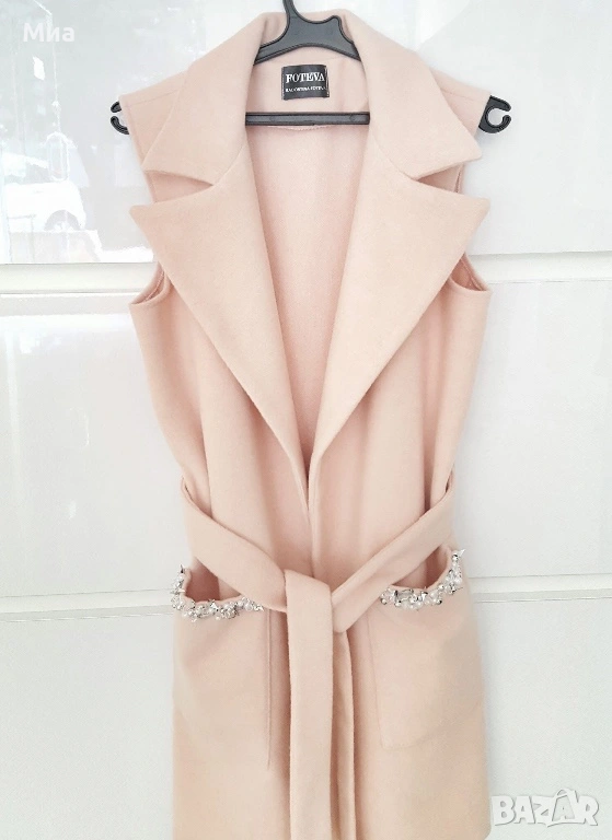 Дамски елегантен елек в нежно розов цвят на българският бранд FOTEVA | Radostina Foteva, размер XS, с два джоба с декорация, с колан. Поддръжка само химическо чистене. В отлично състояние.