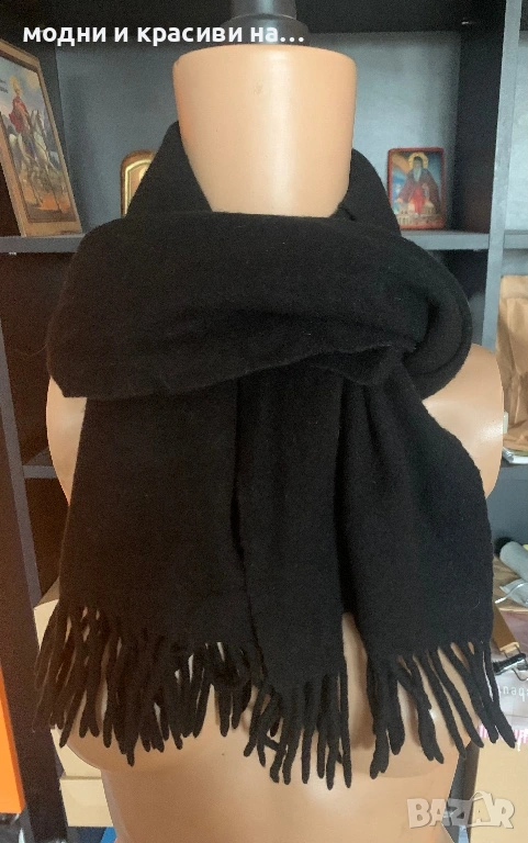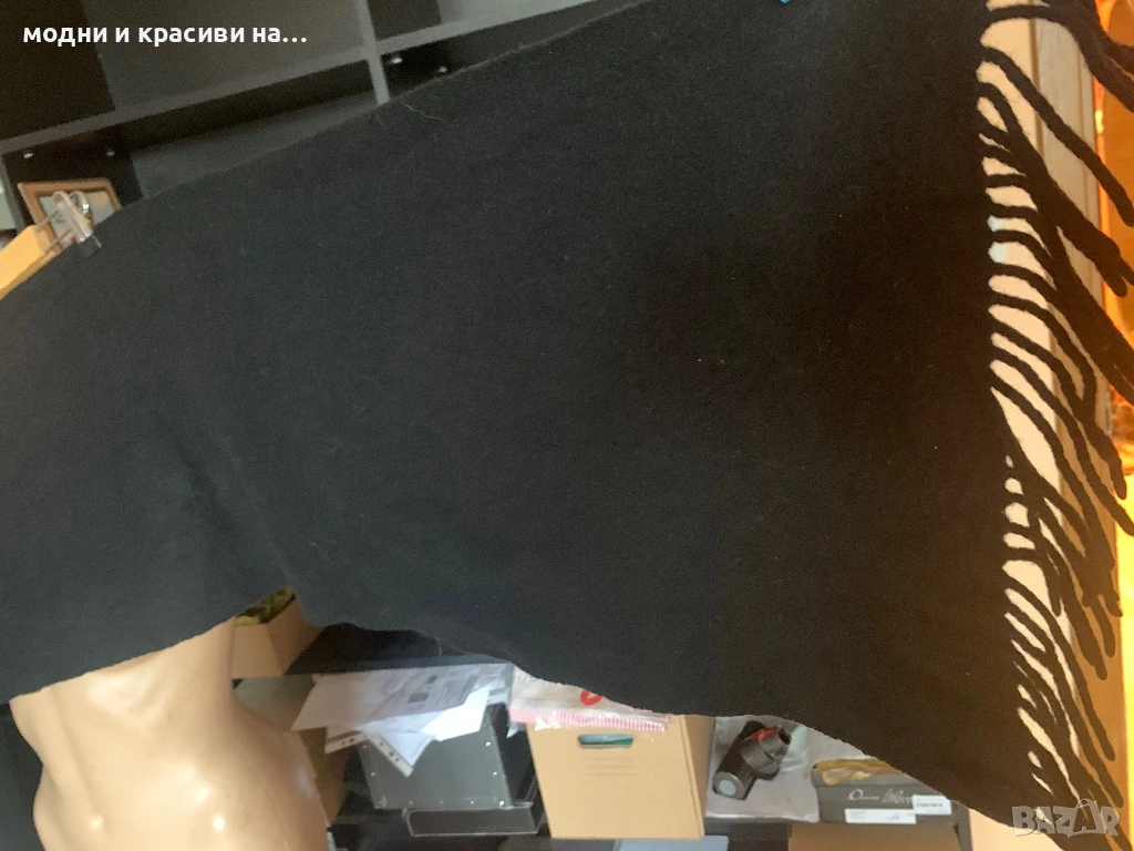 Универсален зимен черен шал с ресни, изработен от фина вълна. На практика може да се съчетае с всичко.Изработен е от фина, мека обработена вълна като го няма неприятния ефект на боцкането.