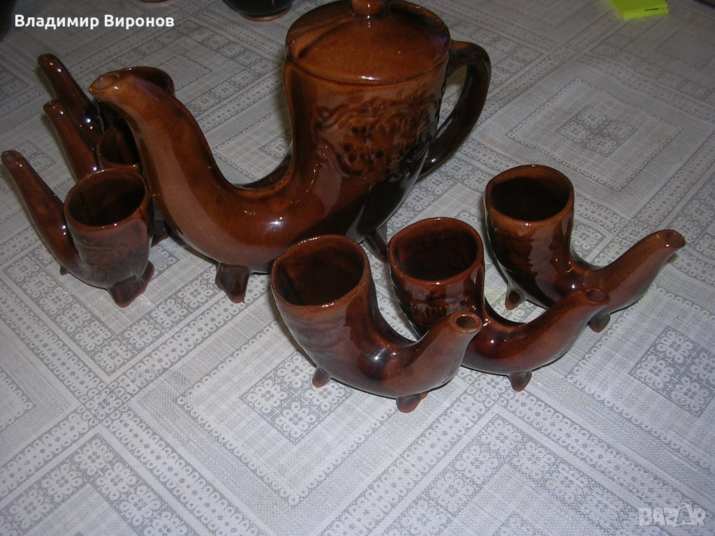 Този комплект за ракия е изработен от керамика в традиционен грузински стил. Той включва каничка 500мл и 6 бр. чаши-50мл с характерна форма -тип рог. Комплектът не използван.