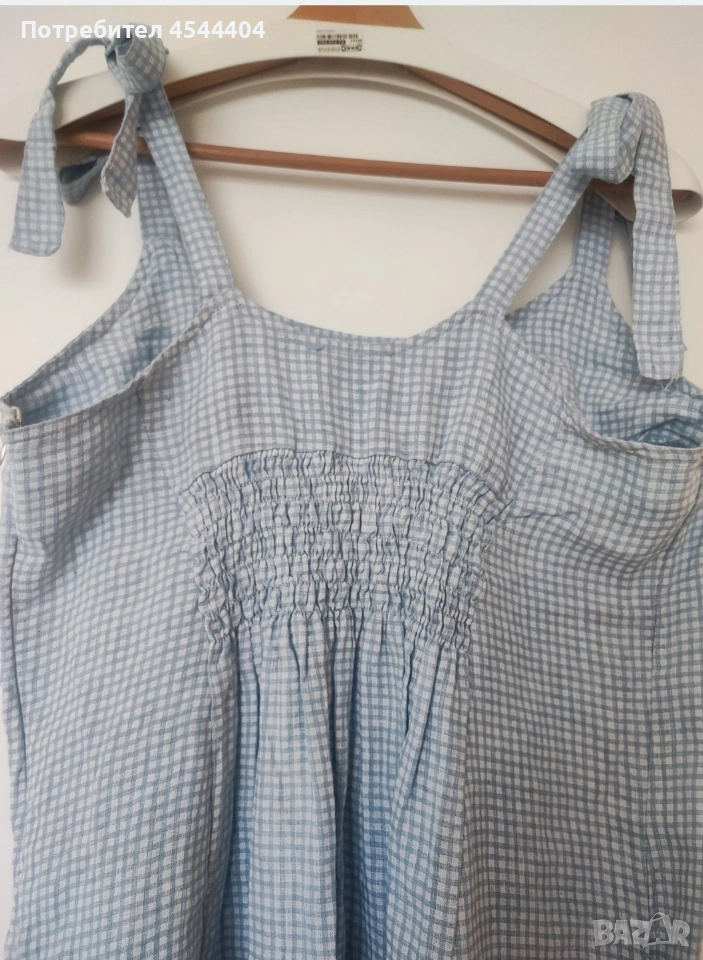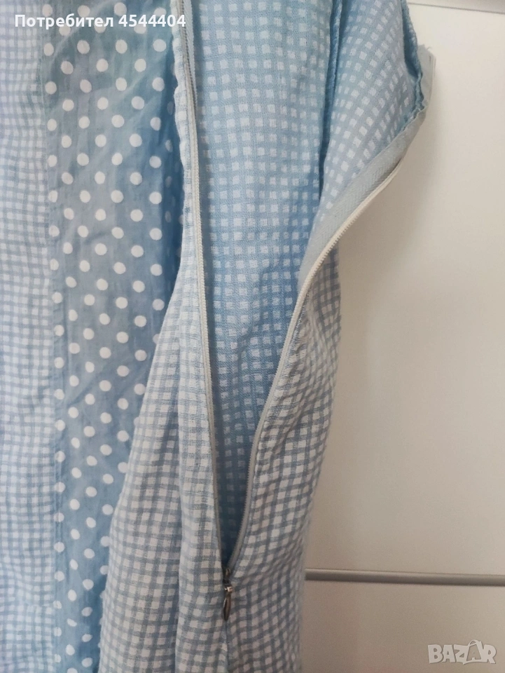 Лятна рокля/съчетание на лен и памук/ в бледо син цвят, подходяща за горещите летни дни, р-р 44/ L/, с цип отстрани,с ластичета в задната част на гърба. Задната част на роклята е по-дълга от предната част.