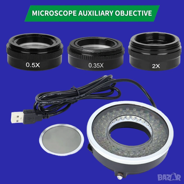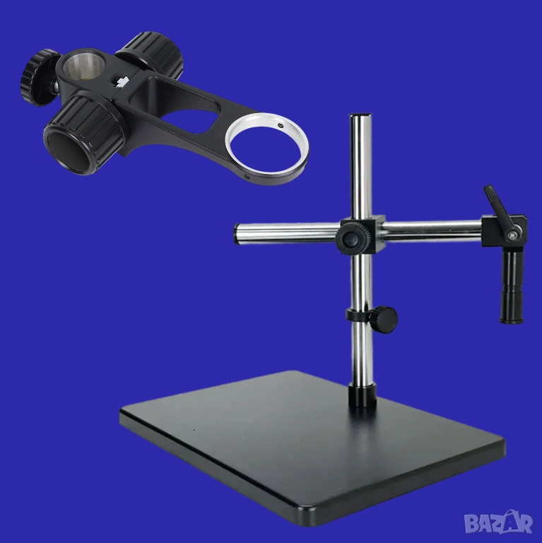 ПЪЛЕН КОМПЛЕКТ със здрава метална стойка + 50мм държач за оптиката, камера + оптика + допълнителни лупи (Barlow lens), поляризирано ринг осветление.
