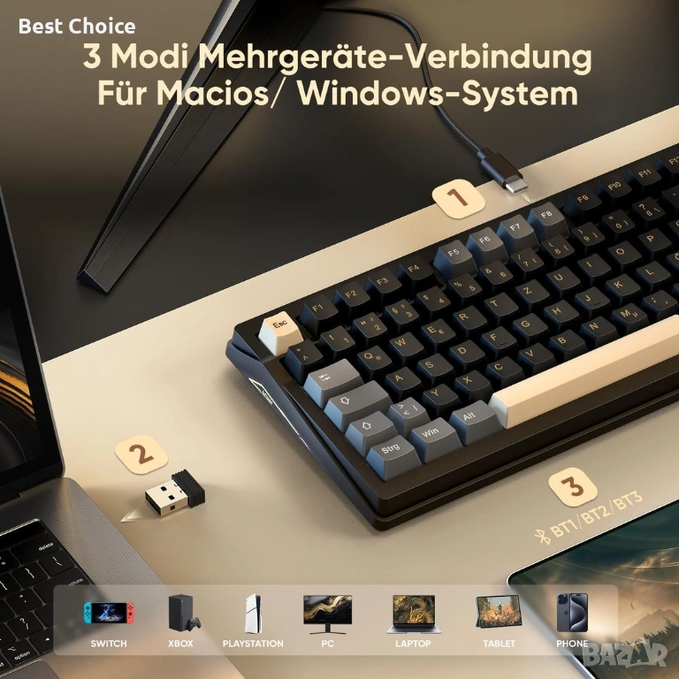 - Троен режим на работа с множество устройства.Той не само елиминира нуждата от кабели за бързо писане, но и осигурява изключително бързо изживяване при кабелен режим при зареждане. С двата превключвателя отгоре можете безпроблемно да превключвате между различни устройства в режими WINDOWS, MacOS, 2.4G безжичен, кабелен и BT, което ви дава свободата да се движите между различни пространства. (Забележка: FN+Q/W/E за превключване между устройства BT1/BT2/BT3).