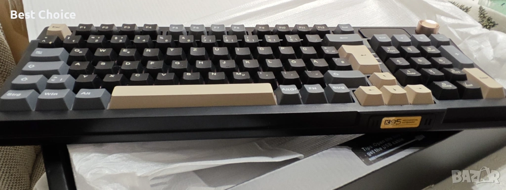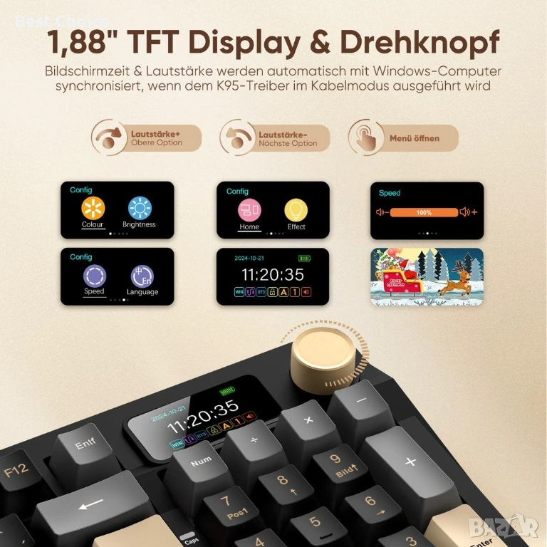 - 1.14" TFT екран и CNC копче. Време е да изберете най-стилната клавиатура за вас. Клавиатурата с уплътнение K95 със сигурност е вашият най-добър избор. Началната страница на 1.14" TFT екрана може да показва дата, час, ниво на батерията, Win/Mac, режим на връзка, състояние на клавишите и др. Можете да регулирате силата на звука, RGB режима на осветление, езика и изображението на екрана/GIF, като завъртите или натиснете CNC копчето