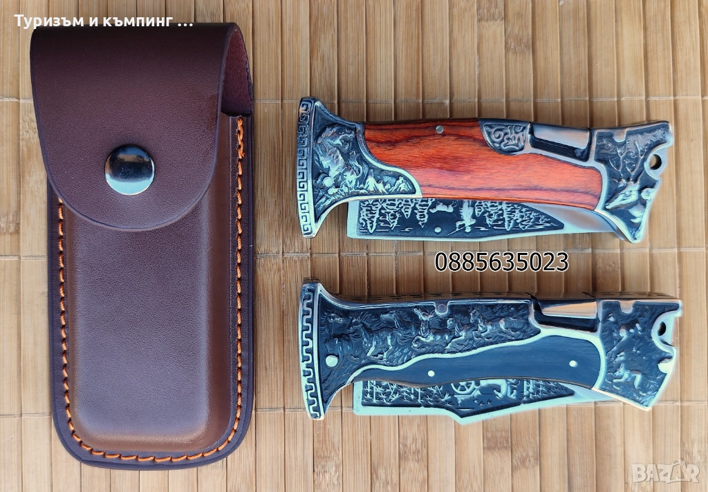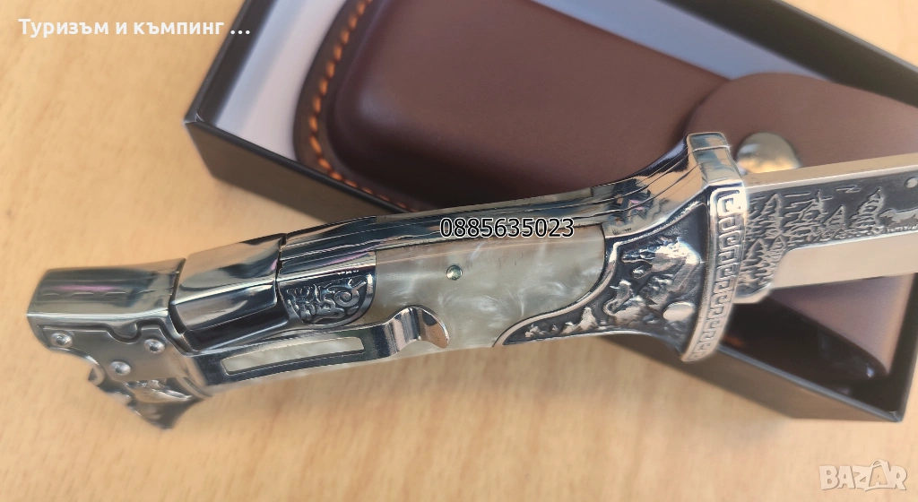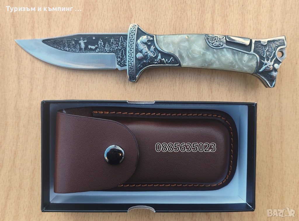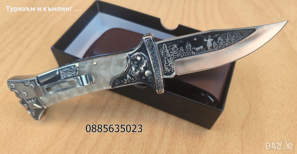 Ножа е в комплект с добре направен кожен калъф и кутия подходяща за подарък.