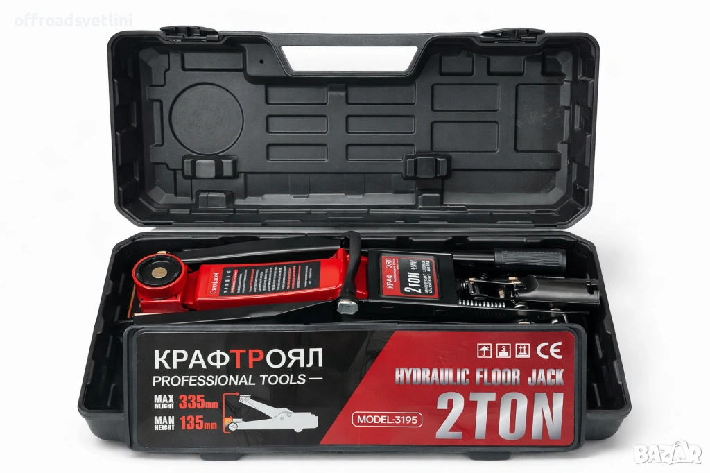 хидравличен крик, крик 2 тона, крик KraftRoyal, автомобилен крик, крик в куфар, професионален крик, подемник за кола, гаражен крик, крик 135-335 мм, CE крик