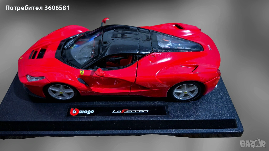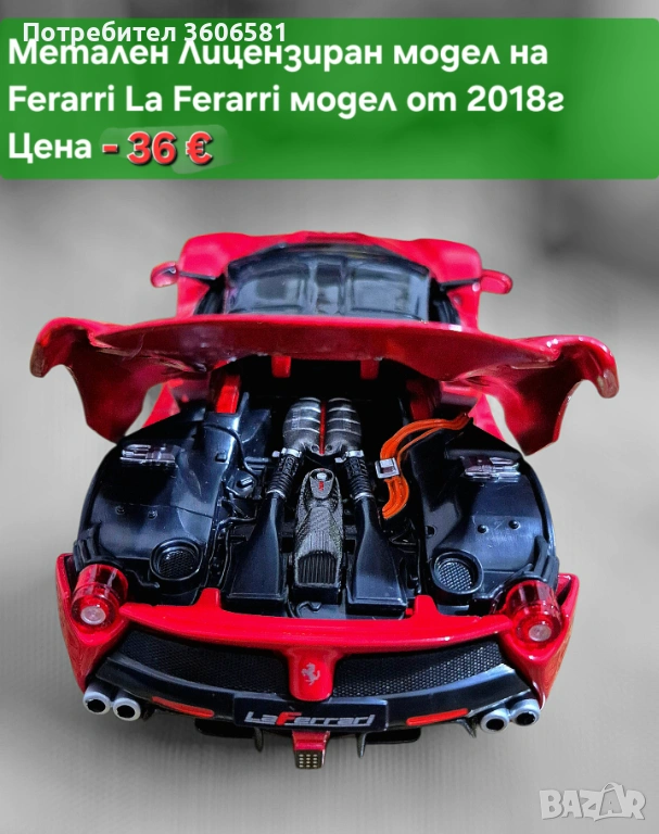 Метален модел на спортната кола на играчка детаилна и реалистичена на Ferrari LaFerrari в съотношение 1:24 спрямо релния размер на колата . Включени батерии за колите . При дърпане назад, след пускане се движи напред самостоятелно, отварящи се врати и капаци, светещи стопове и фарове, звук на двигателя при тръгване и спирачки. Подходящ подарък за деца или колекционери на умалени и реалистични модели на спортни автомобили.