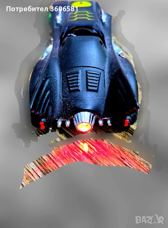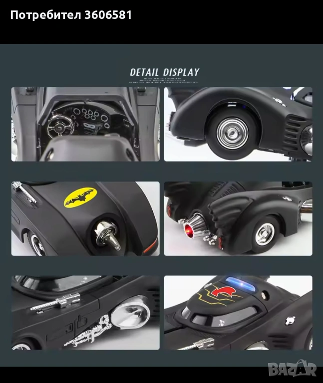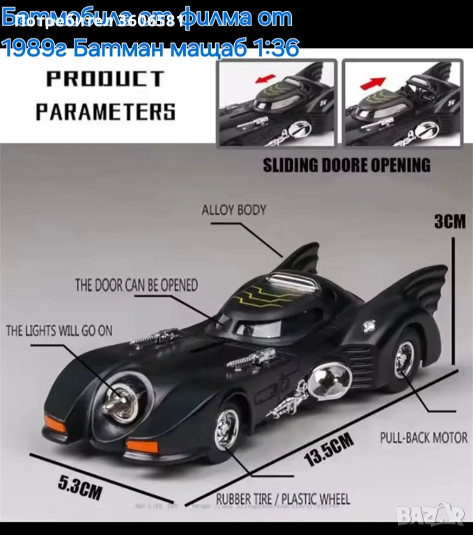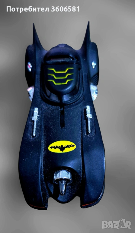Умален модел на колата на Батман от филма от 1989г в мащаб 1:36. При дърпане назад, след пускане се движи напред самостоятелно посредством навиваща се пружина, отваряща врата, при натискане на предните колела звук от колата както на двигателя така и при стрелба, светещи стопове, фарове, ауспух.