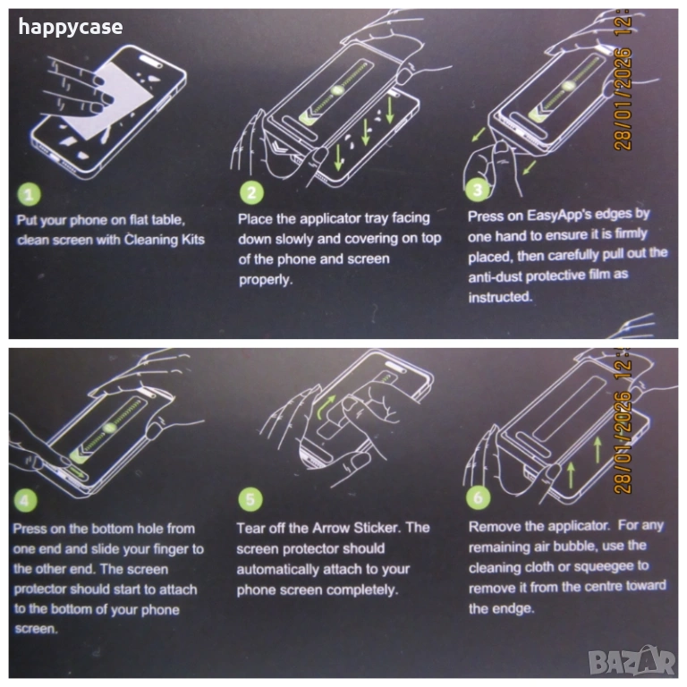 Процедурата е показана и на последната снимка на която е сниман гърба на кутията. Звучи сложно, но на практика се реализира за няколко минути без сериозни усилия и задълбочени познания за монтаж на стъклен протектор. За улеснение слагаме и линк към един от многото клипове за монтаж на такъв вид протектор: