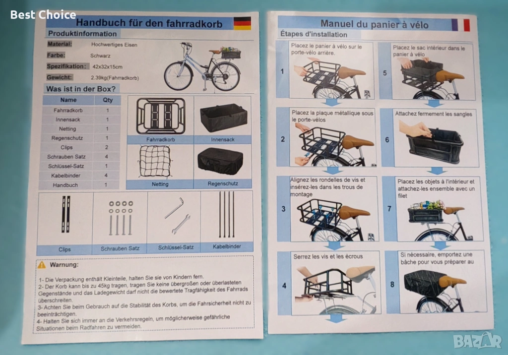 Тази кошница е изработена от здрав метал с висока товароносимост и тежи 2,4 кг. Тя е много издръжлива и устойчива на деформация.
