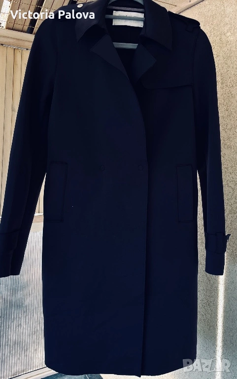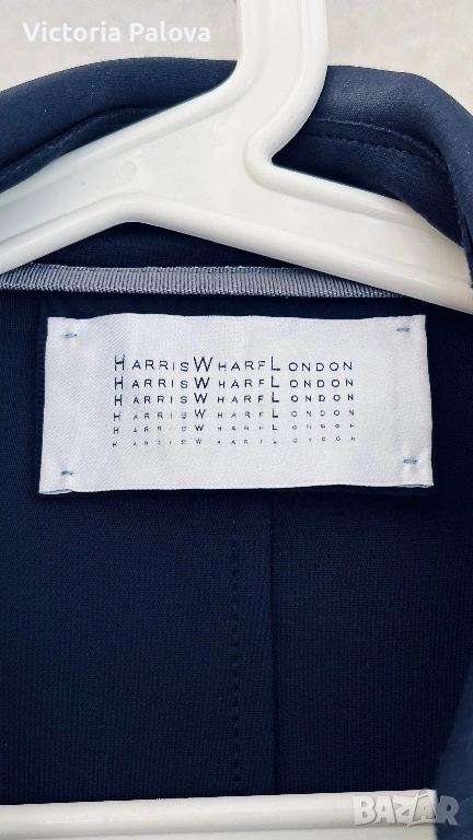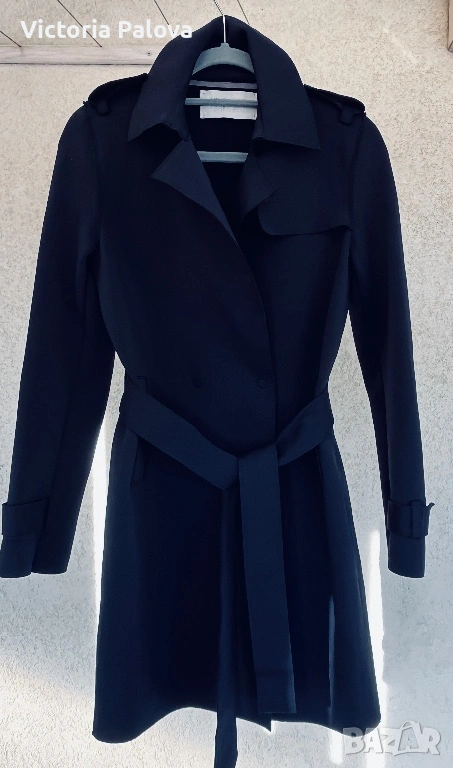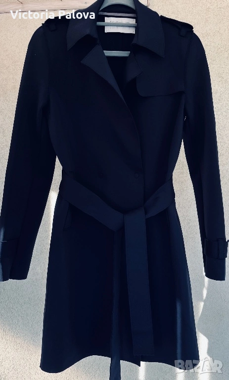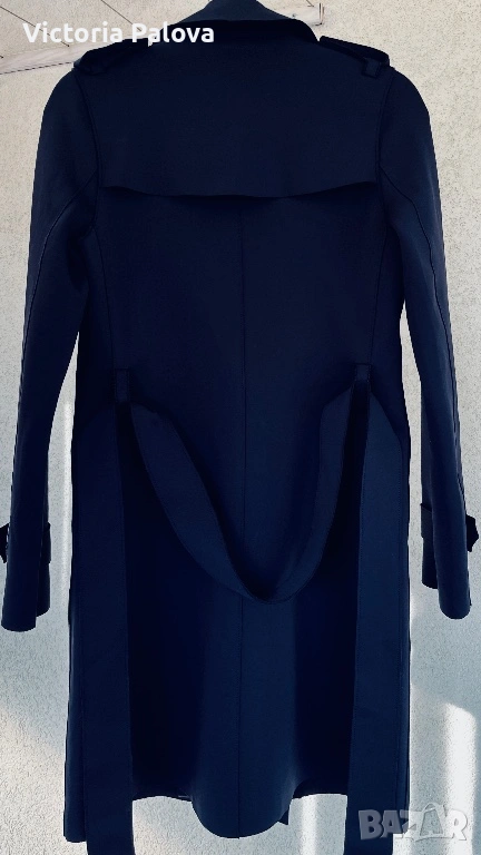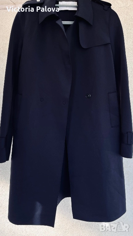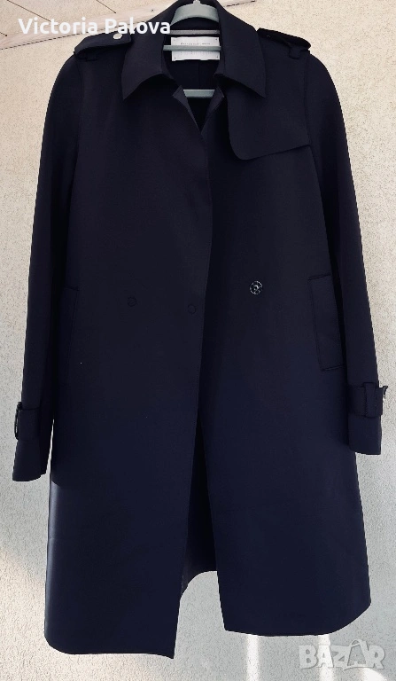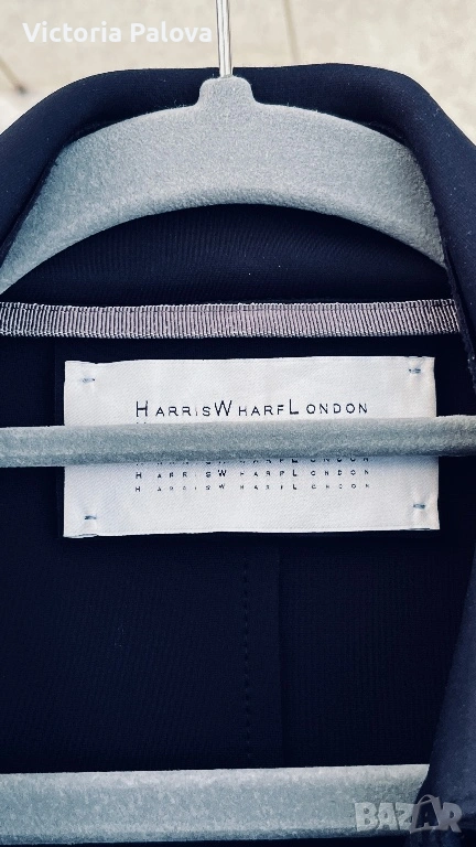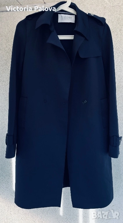 Оригинален дизайнерски тренч Harris Wharf London в отлично състояние. Брандът е утвърдено име в съвременния лукс и е разпознаваем с изключително чистите си линии, архитектурна кройка, интелигентен минимализъм и използването на висококачествени иновативни материи. Моделът е произведен в Италия от характерния за марката scuba Jersey - еластична , гладка и структурирана материя , която държи формата на силуета без подплата. Кройката е минималистична, със скрито предно закопчаване, което запазва изцяло изчистения външен вид. Детайлите включват еполети на раменете, регулируеми колани на ръкавите и странични джобове. Цветът е тъмносин ( navy), класически и универсален. Тренчът е комфортен и подходящ за преходните сезони, с дизайн, който остава актуален години наред. Реалната му магазинна цена е 762$ , което позиционира модела във високия дизайнерски сегмент. Рамо - 40 см. ГО - 44см, дължина - 91см, ръкав - 61см.