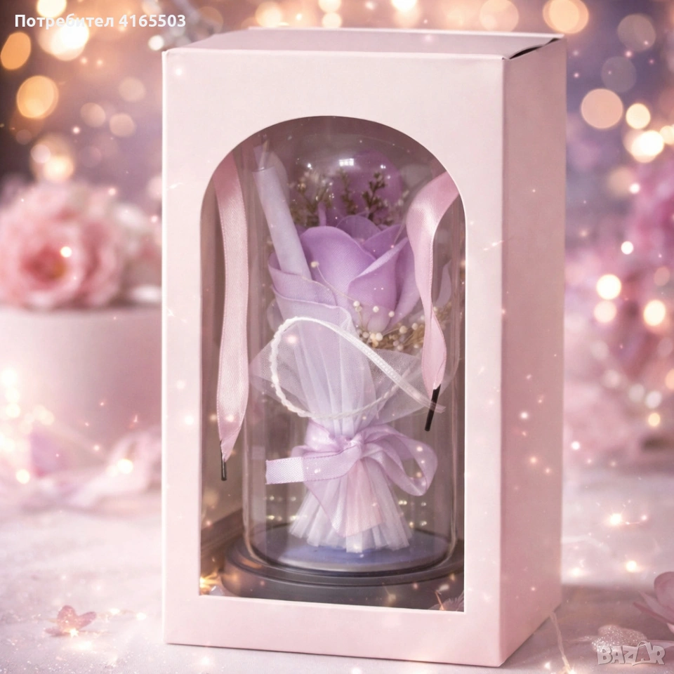 Декоративна роза в стъклен купол - В подаръчна кутия → Обява 53059748
