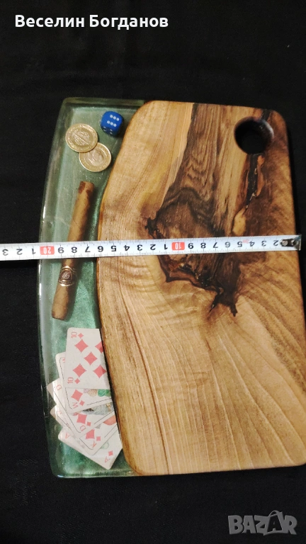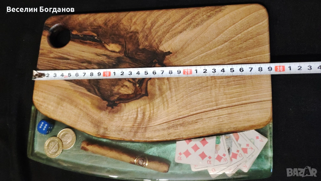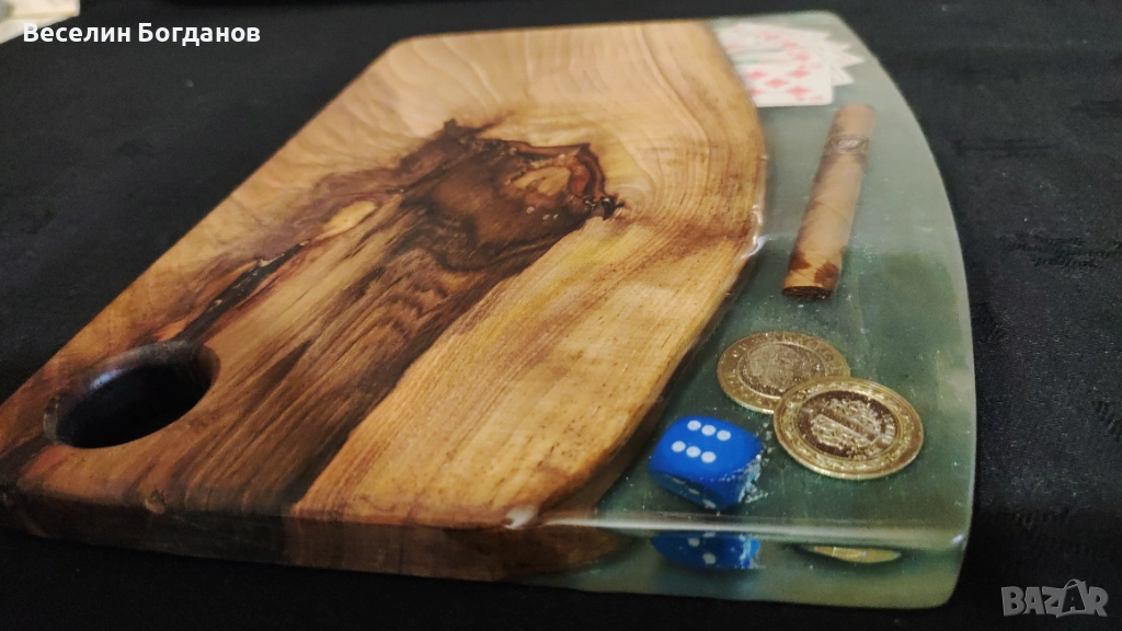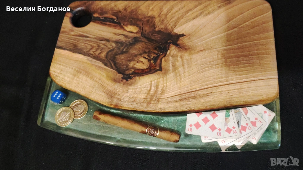 Предлагам уникална ръчно изработена дъска от масивен орех и епоксидна смола, подходяща както за рязане, така и за сервиране. Дъската съчетава естествената красота на ореховата дървесина с модерния акцент на смолата, което я прави единична бройка – няма втора същата.