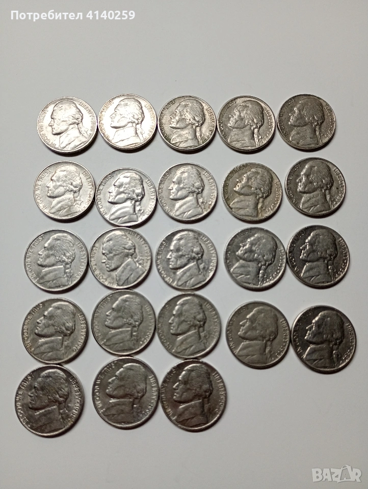 САЩ МОНЕТИ 5 ЦЕНТА ЛОТ 1970 - 1993 Г НЕПОВТАРЯЩИ ЦЕНА ЗА 23 БРОЯ НЕЧИСТЕНИ СЪСТОЯНИЕ ОТЛИЧНО ПОЛУЧАВАТЕ СНИМАНИТЕ МОНЕТИ РАЗГЛЕДАЙТЕ ДРУГИТЕ МИ ОБЯВИ ДА КОМБИНИРАТЕ ДОСТАВКА ЕКОНТ ЗА ВАРНА ЛИЧНО