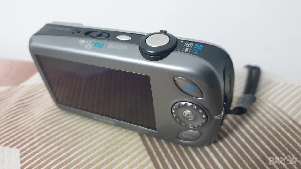 Canon.Фотоапарата е с много запазен външен вид.Изключително бърз автофокус на обектив с фокусно разстояние 28-112mm цифрово увеличение 4х съчетан с 12.1 МрХ матрица и в комбинация с този светлосилен обектив прави невероятни снимки с наситена цветност и нюанси на изображението.Фотоапарата прави видео въвъ