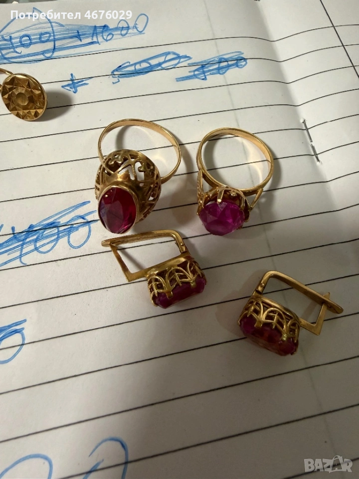 Продавам комплект от два пръстена и чифт обеци с красиви рубинено-червени камъни. Обковът е във винтидж стил, с изящна