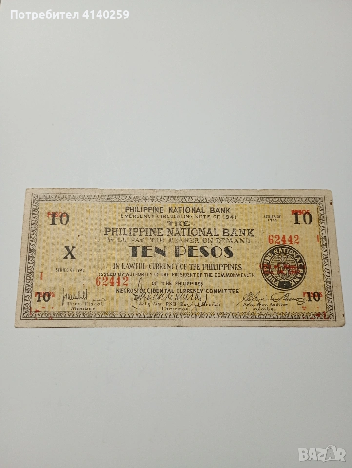 ФИЛИПИНИТЕ БАНКНОТА 10 ПЕСО 1941 Г СЪСТОЯНИЕ ОТЛИЧНО ПОЛУЧАВАТЕ СНИМАНАТА БАНКНОТА РАЗГЛЕДАЙТЕ ДРУГИТЕ МИ ОБЯВИ ДА КОМБИНИРАТЕ ДОСТАВКА ЕКОНТ ЗА ВАРНА ЛИЧНО