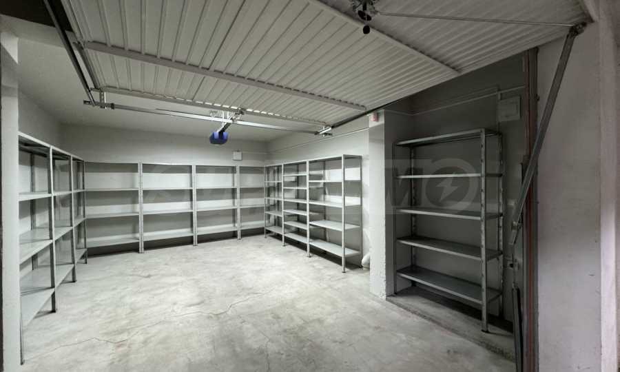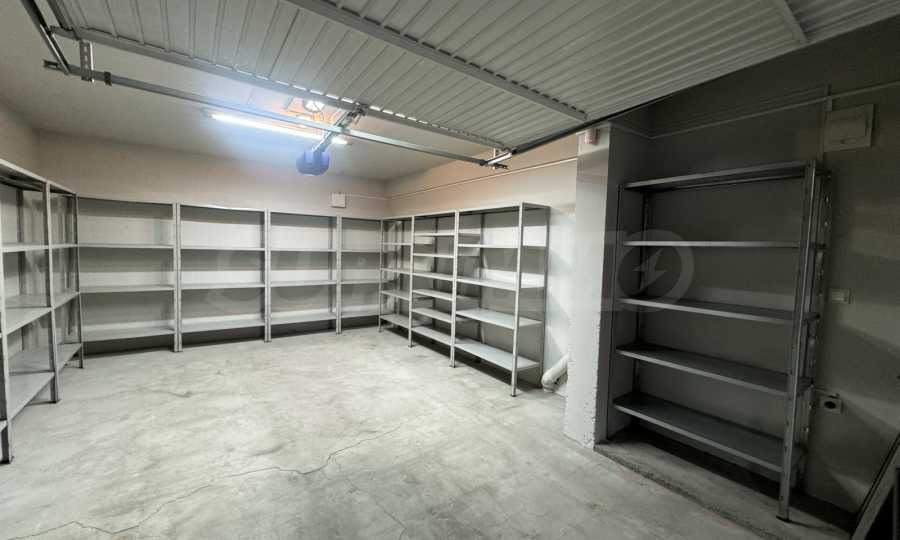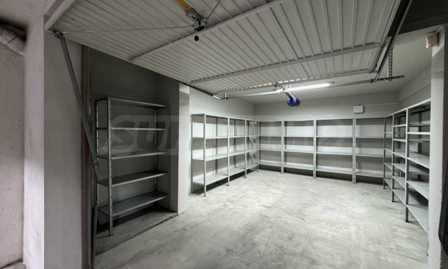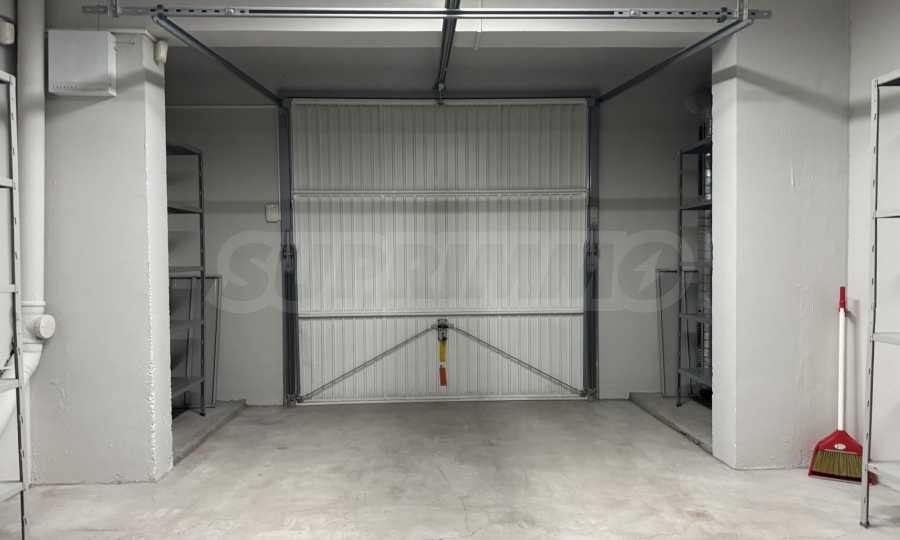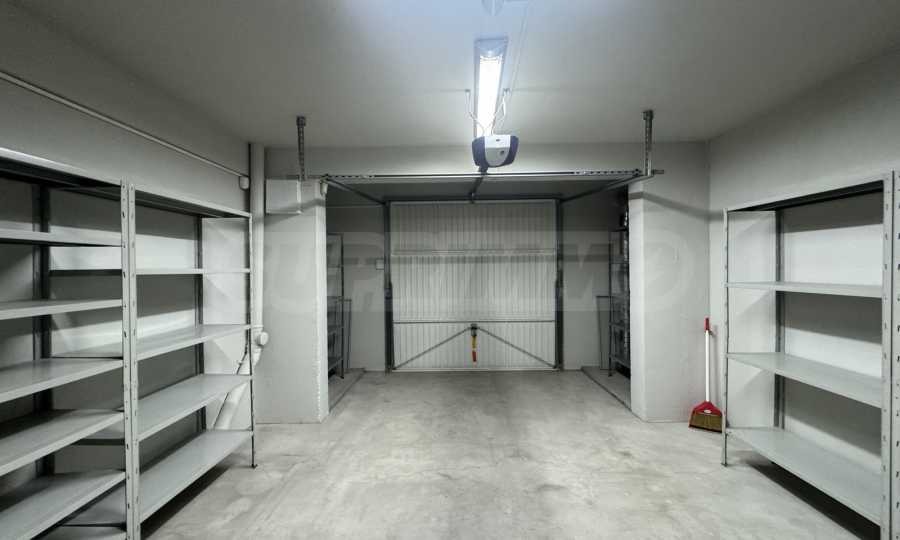 Гаражът е с нивелиран под, автоматична врата с дистанционно управление, индивидуална охранителна система - СОТ с дистанционно управление, самостоятелно ел.табло с отделна партида, оборудван със складови стелажи на всички стени и връзка с вентилационната система.