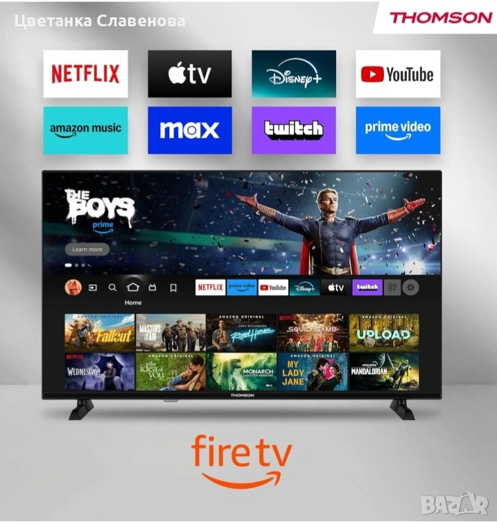 Alexa, AirPlay, Wi-Fi, троен тунер (кабел/сателит/антена), Bluetooth 5.0, HDMI, USB, AV IN, CI+, 32HF2S34 40-инчов FHD Smart Fire телевизор: Лесно достъпвайте любимите си приложения, игри и стрийминг услуги и предавайте съдържание от вашите Apple устройства директно към телевизора си чрез AirPlay. Създавайте персонализирани потребителски профили и получавайте целенасочени препоръки. Гласово управление с Alexa: Управлявайте телевизора си, търсете съдържание или получавайте препоръки удобно, използвайки гласа си. Интеграция с интелигентен дом: С интегрираното табло за управление на интелигентен дом можете да следите устройствата си за интелигентен дом и да ги управлявате директно. Троен тунер и CI+: Приемайте програми чрез кабел, сателит или антена и останете оптимално свързани благодарение на Bluetooth и Wi-Fi, както и на HDMI и USB портове, AV IN и CI+. Ергономично дистанционно управление: Bluetooth дистанционното управление предлага директен достъп до Netflix, Prime Video, Amazon Music и бутон Alexa за лесни гласови команди. Потопете се в нов свят на домашното забавление с Thomson Fire TV 40" FHD – перфектната комбинация от полезни технологии и лесни за употреба функции. Благодарение на интуитивната операционна система Fire TV, имате лесен достъп до любимите си приложения, игри и стрийминг услуги. Персонализирайте телевизионното си изживяване с множество потребителски профили, които предлагат персонализирани препоръки и настройки. Управлявайте телевизора си с гласови команди Alexa, търсете съдържание и управлявайте устройствата си за интелигентен дом просто с гласа си. Стриймвайте съдържание директно от устройства на Apple чрез AirPlay и следете дома си благодарение на интегрираното табло за управление на интелигентен дом. Тройният тунер позволява приемане на кабелни, сателитни и ефирни сигнали за максимална гъвкавост. Насладете се на ясен звук с Dolby Audio и Dolby Digital Plus, както и на качество на картината в HD резолюция и HDR10. Всичко това с ясната и прецизна картина на FHD телевизор. Свържете устройствата си чрез HDMI и USB портове или използвайте CI+ връзката. Bluetooth дистанционното управление предлага директен достъп до Netflix, Prime Video и Amazon Silk Browser, плюс бутон Alexa за лесно гласово управление. Открийте свят на забавления с Thomson Fire TV. Телевизор Inteligent Led Hd Thomson De 32 De Inci (80 Cm) Cu Fire Tv, Control Vocal Alexa, Airplay, Wi-Fi, Tuner Triplu (Cablu/Satelit/Antena), Bluetooth 5.0, Hdmi, Usb, Intrare Av, Ci+, 32Hf2S34