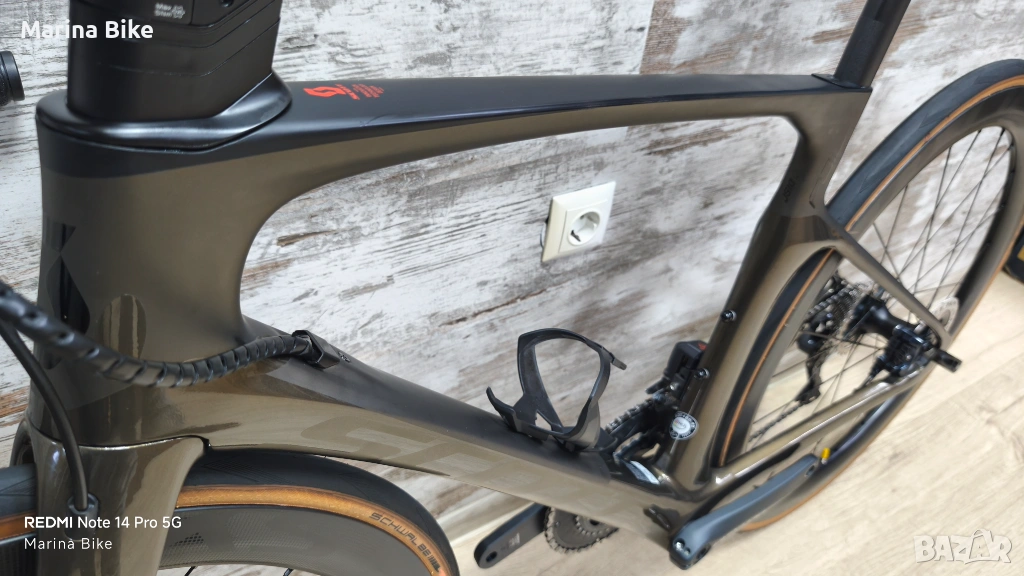 Велосипедът е в изцяло фабрична сглобка, оборудван с пълен електронен монтаж 2х11 скорости Shimano Ultegra R8070 Di2 и карбонови клинчър капли Syncros Merritt 1.0 50 Disc.