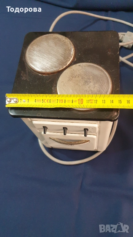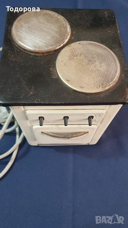 Старинен умален рекламен модел на елктрическа печка. Работеща на ток - котлони и фурна в изправност- загряват.Използвана като рекламна мостра.Височина - 19 см.Плот - 14 х 15 см.