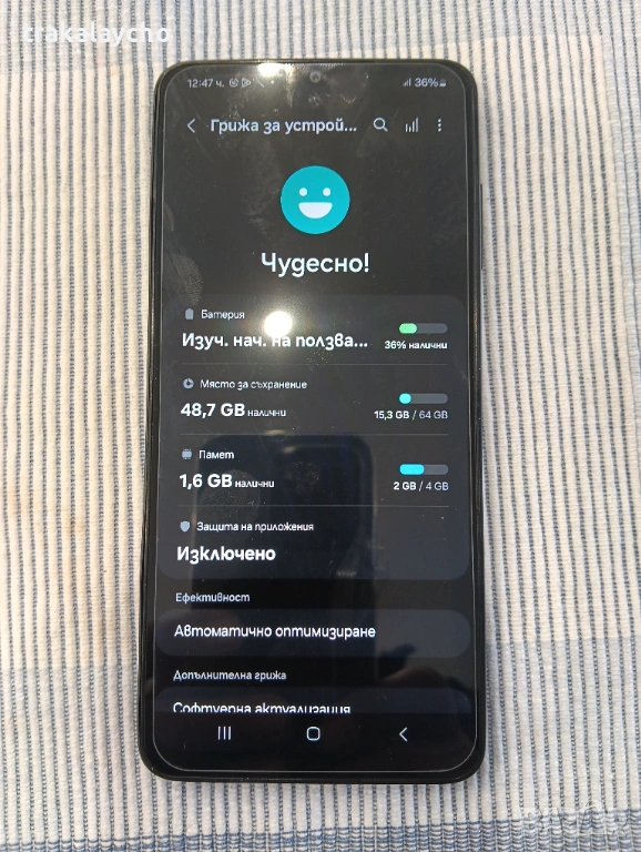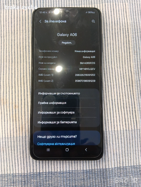 Самсунг Галакси А06 - изключително запазен и перфектно работещ телефон. Батерията е нова - старата е сменена с нова оригинална такава. Има протектор на дисплея и черен силиконов кейс. Цената е само за телефона от снимките и е крайна. При необходимост от зарядно мога да го осигуря срещу още 10 евро. Изпращам с Еконт или Спиди, като при отказ купувача заплаща куриерските такси за двете посоки.