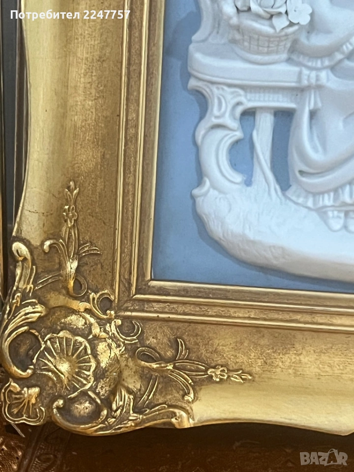 • Рамка: Масивна, богата позлатена рамка в стил Барок/Рококо, която придава на предмета внушителен и аристократичен вид.
