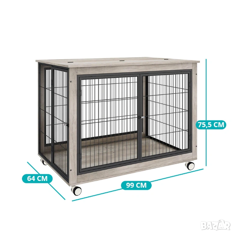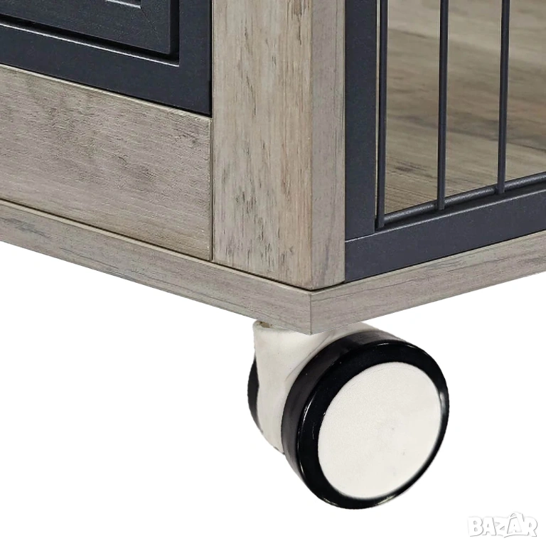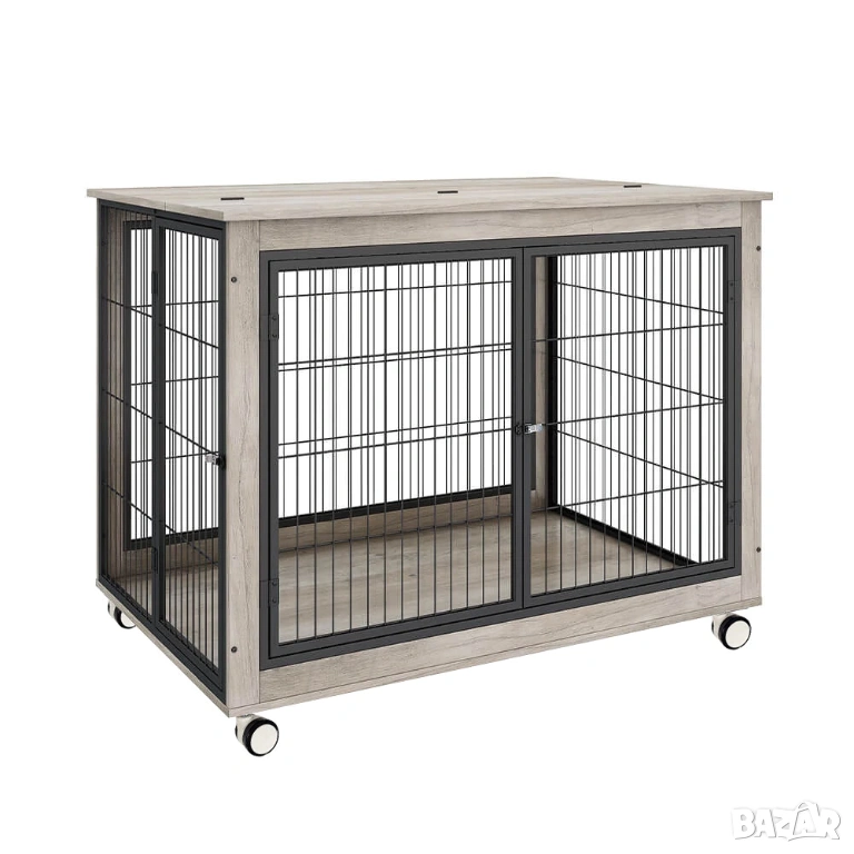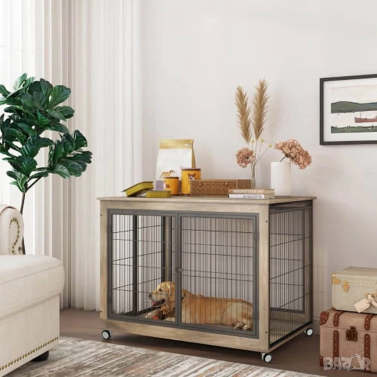 Осигури сигурно и спокойно място за своя домашен любимец с тази вътрешна клетка за куче за вкъщи, създадена специално за употреба в апартамент. Подходяща е за почивка, сън, кратък престой при отсъствие от дома или в стресови ситуации. Стабилната конструкция от дърво и метал гарантира безопасност, а отваряемият горен капак улеснява почистването и достъпа до животното. Благодарение на вградените колела, клетката се премества лесно между стаите. Идеално решение при сепарационна тревожност, обучение или когато искаш да запазиш дома си подреден и защитен.