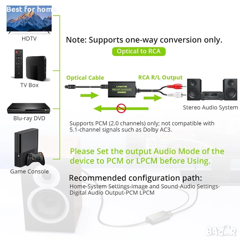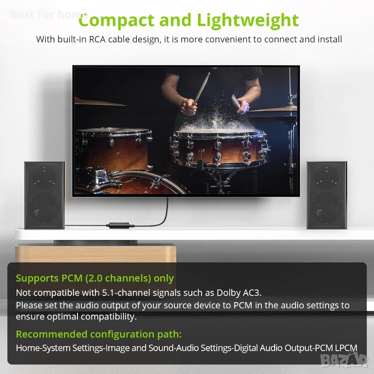 Множество входове: Поддържа Optical (Toslink) и Coaxial входове.