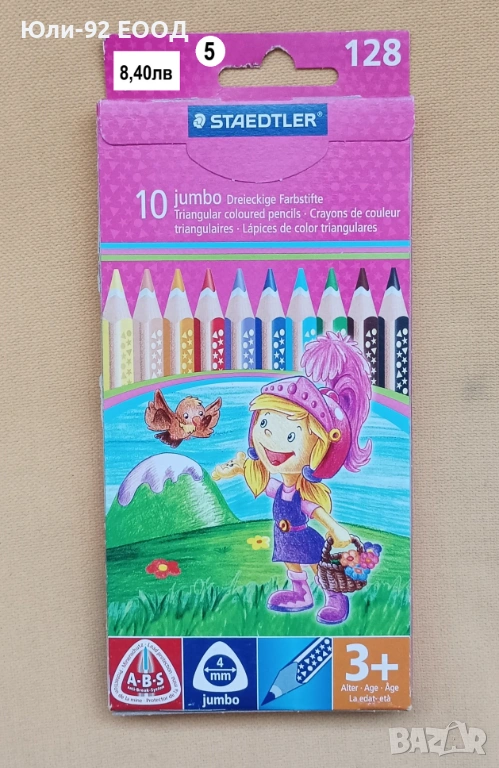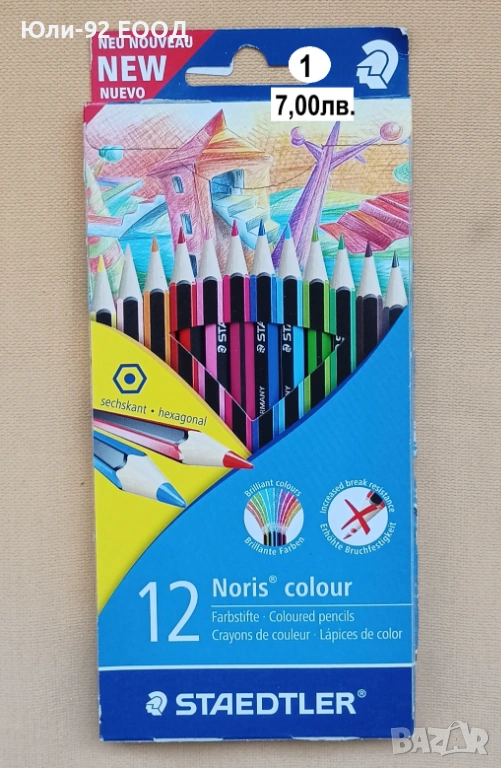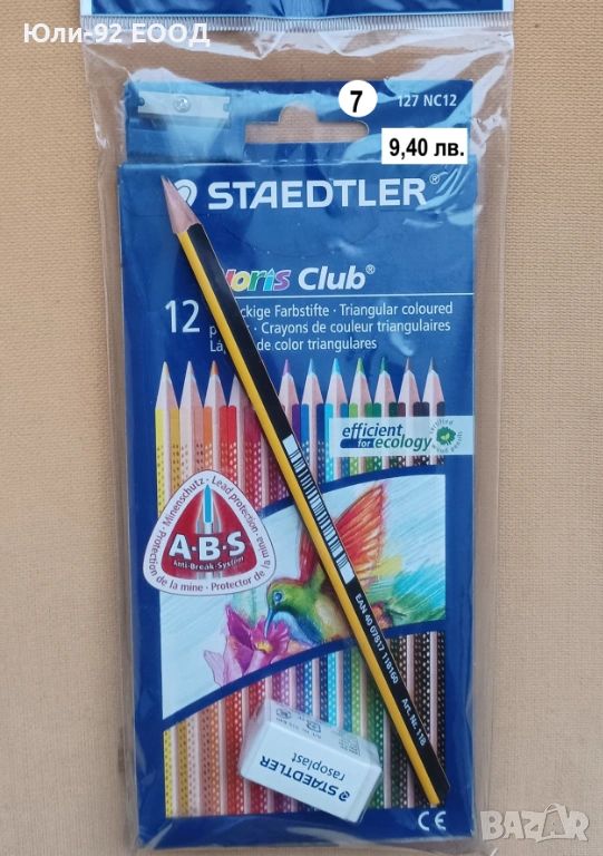 7/ Комплект чернографитен молив, гума, острилка и 12 цветни молива /в кутия/ с ергономична триъгълна форма, с атрактивен дизайн със звездни фигурки и АBS-бяло защитно покритие на графита, увеличаващо нечупливостта му. Цена 9,40 лв.