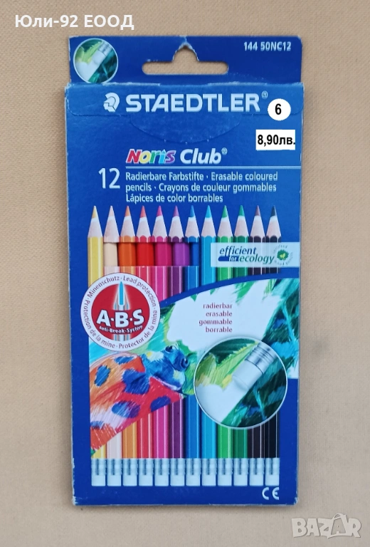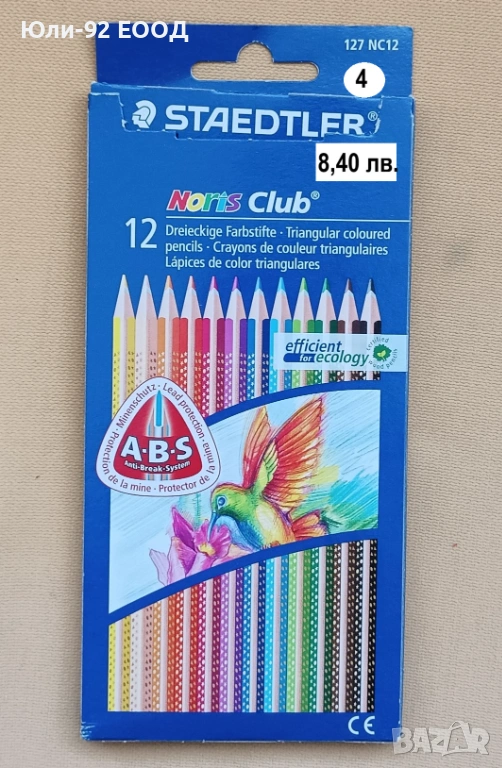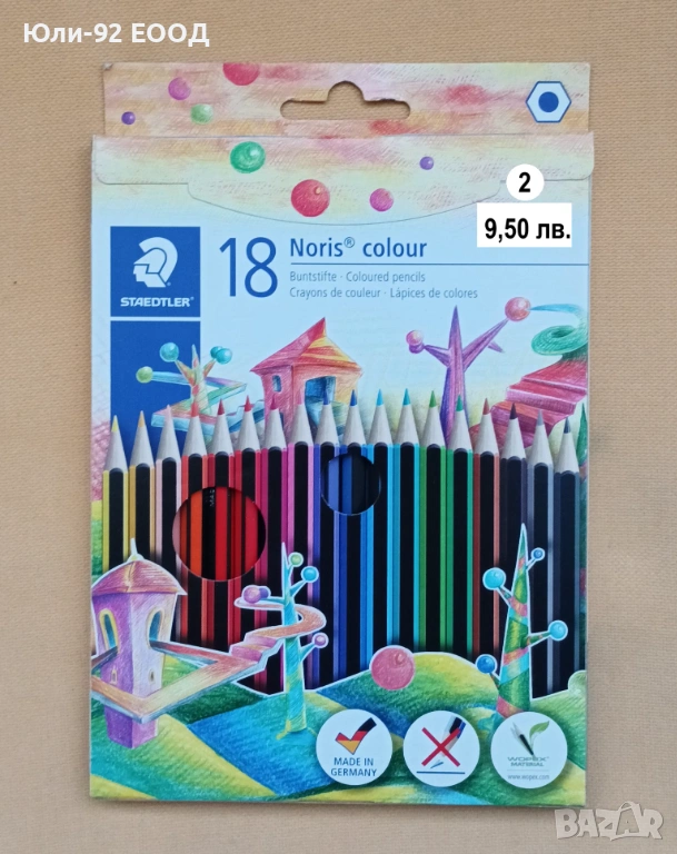 А/ Цветни моливи STAEDTLER, произведени в Германия. Дървесина, произведена от PEFC-сертифицирани немски гори. Мек графит в ярки, наситени цветове, подсилен срещу начупване. В картонена кутия.