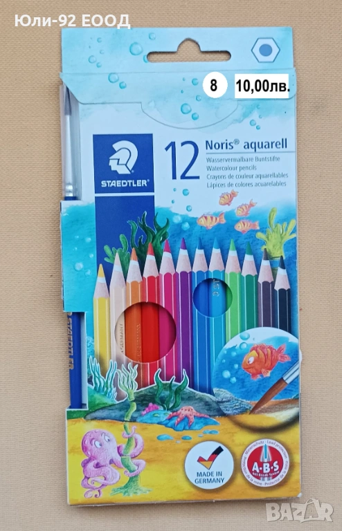 8/ 12 акварелни цветни молива със шестоъгълна форма и четка за рисуване. Особено мек, водоразтворим графит, допълнително подсилен срещу начупване с АBS-бяло защитно покритие. Цена 10,00лв.