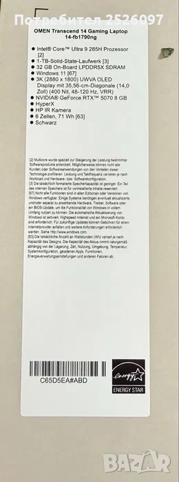 Чисто нов лаптоп HP Omen Transcend Gaming 14 акупен от Германия на 11.11.2025г за 2000 евро с две години международна гаранция .