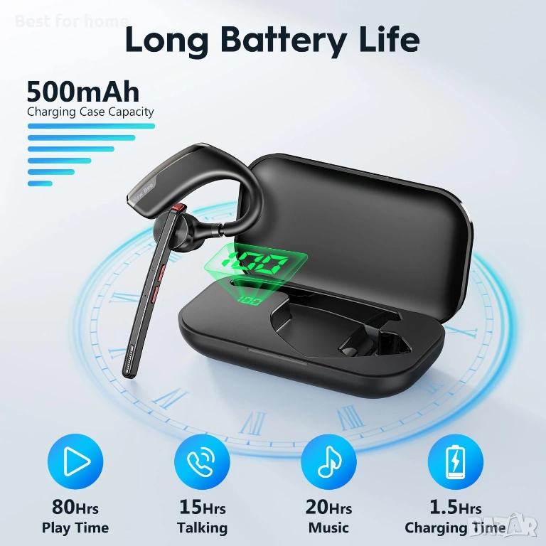 Впечатляваща батерия: Поддържа до 24 часа непрекъснати разговори или 20 часа слушане на музика с едно зареждане. В режим на готовност издържа до 60 дни.