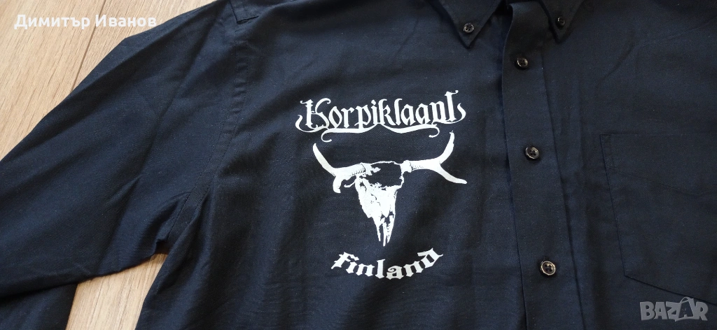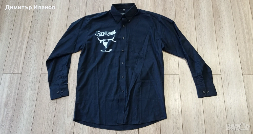 Продавам риза на Korpiklaani, официален мърч на бандата. За съжаление, се оказа твърде дълга за моя ръст (182 см). Пробвана е 5 мин. - не е гладена, не е прана, продавам я в чисто ново състояние, като спестявам доставката от Финландия до България в оферираната цена. Параметрите са следните: