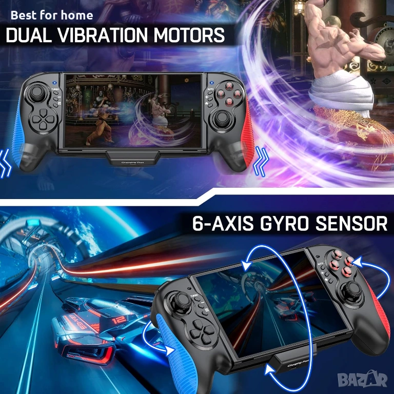 Двумоторна вибрация и 6-осен аоматосензорен контрол: Подобрено игрово изживяване. Вградени двойни мотори с реалистична игрова обратна връзка; Безупречен соматосензорен контрол с 6-осен жироскопичен чип за прецизен соматосензорен контрол, идеален за състезателни игри; Забележка: Бутонът за превключване/превключване на OLED хост е наличен на джойстика, моля, изберете правилния режим на хост.