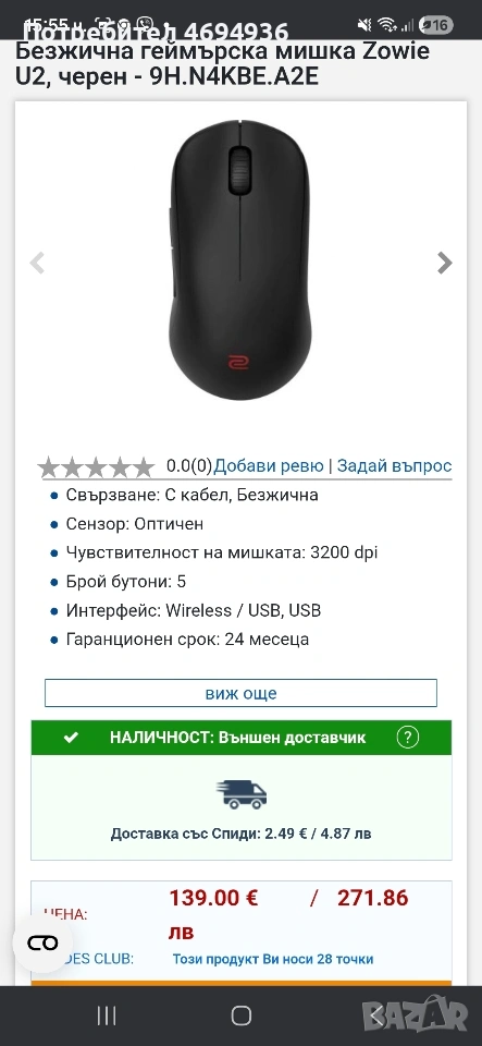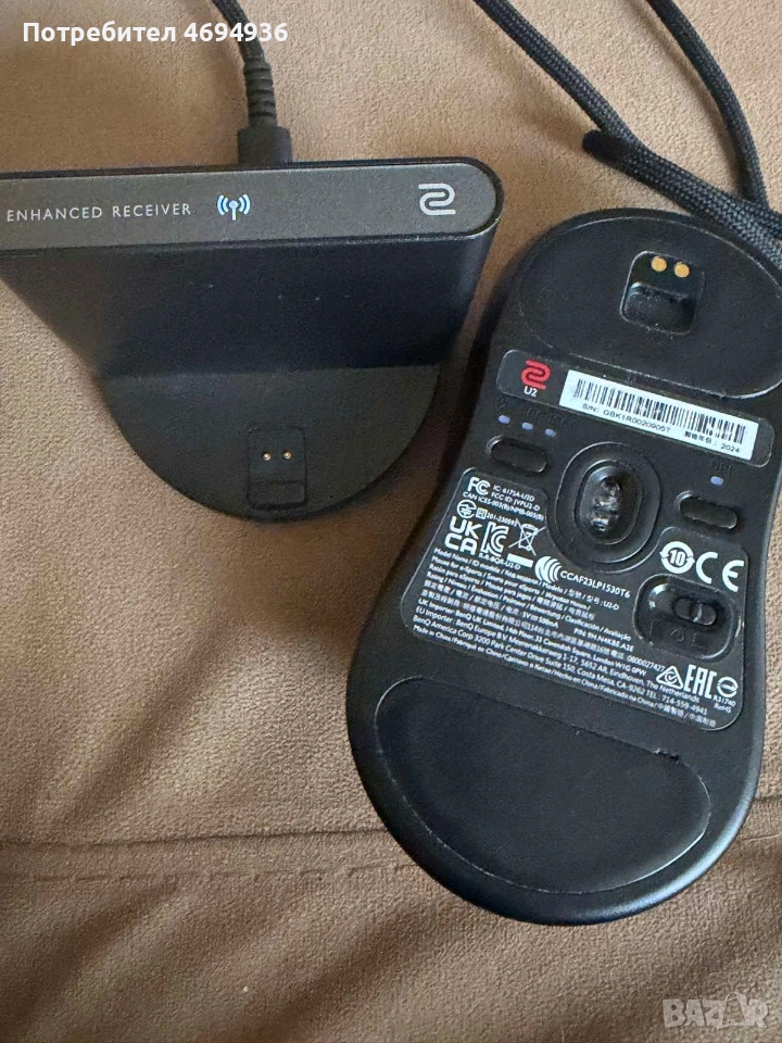 Безжична геймърска мишка Zowie U2, черен - Добави ревю | Задай въпрос Свързване: С кабел, Безжична Сензор: Оптичен Чувствителност на мишката: 3200 dpi Брой бутони: 5 Интерфейс: Wireless / USB, USB Разгледай още страхотни предложения Други клинти хатресаха също: Производител: Zowie; Код на продукта: Технически параметри Свързване: С кабел Безжична Сензор:ОптиченВид на сензора:PixArt PAW3395 оптиченЧувствителност на мишката:3200 dpiПодходяща за игри:ДаБрой бутони:5Интерфейс: Wireless / USB донгъл USB Скорост на предаване:1000 Hz Polling RateДизайн:СиметриченДължина на кабела:2 метраИздръжливост на батерията:до 70 часаАксесоари:USB Type-C към USB кабел в комплектаЕкстри: Режим на работа: 2.4 GHz Motion Sync проследяване на движенията Размери:124 x 65 x 38 ммТегло:60 грамаЦвят:Черен