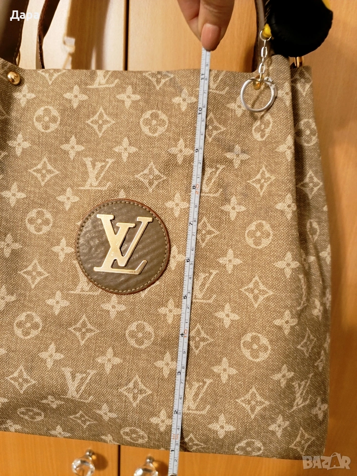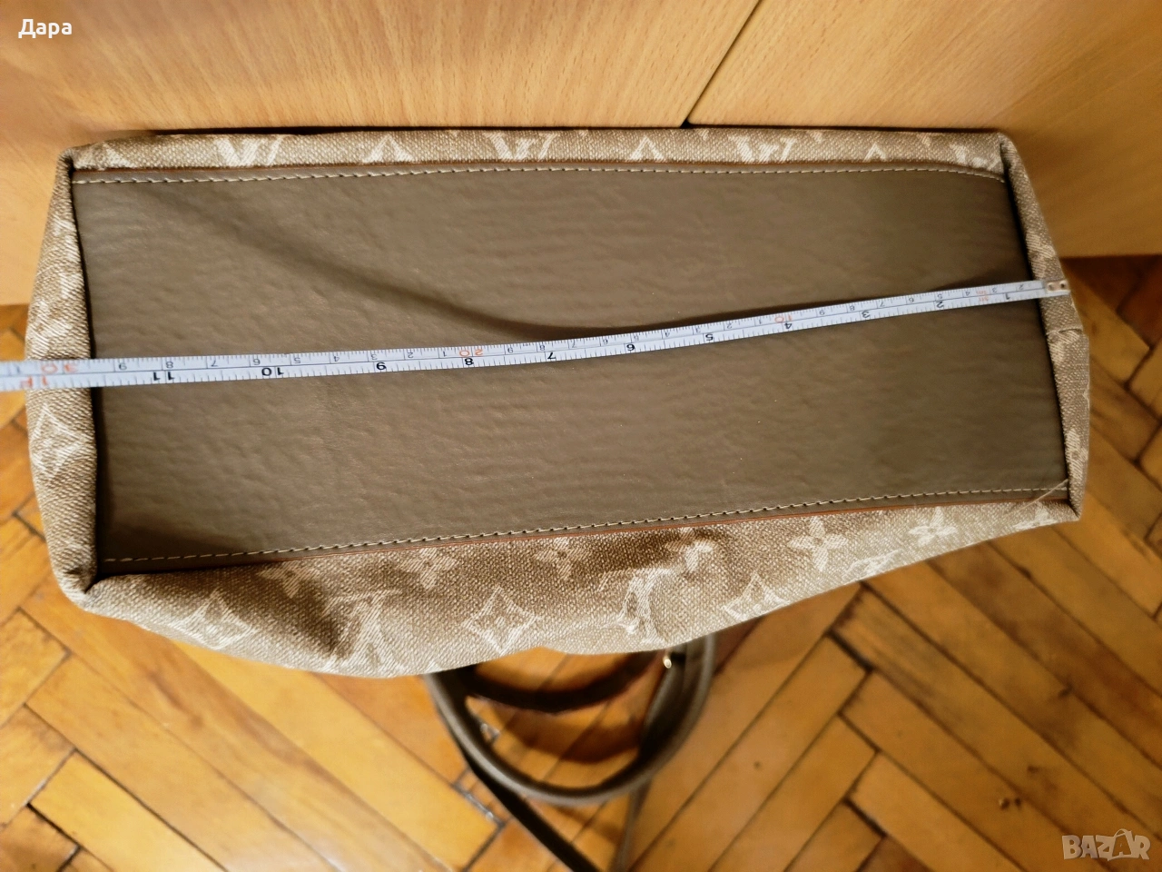 Дамска чанта Louis Vuitton. Чантата е предимно в светлокафяв/бежов цвят. Размери дъно - 30/11см, височина - 28 см., ширина 30 см. Купувана от Турция. С къса, дълга дръжка, малко портмоне. Затваря се с цип. Не е използвана! Без забележки