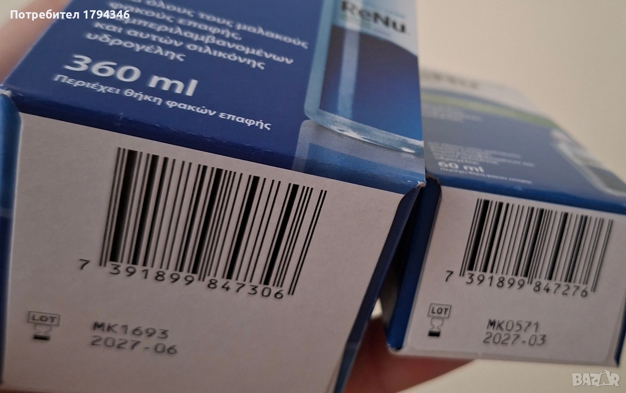 Разтвор ReNu 360 мл (11,50 €/бр.) и 60 мл (4 €/бр.). Всеки разтвор идва с контейнер.