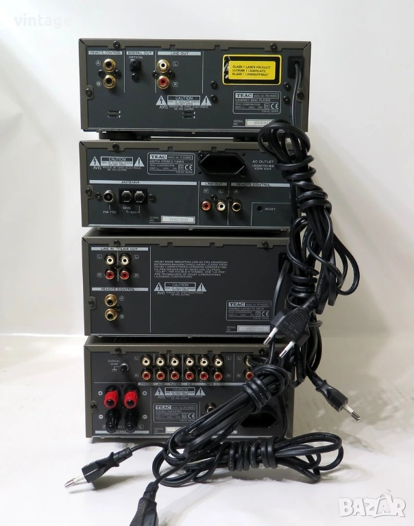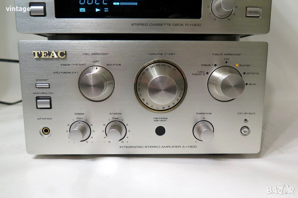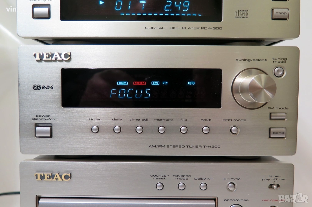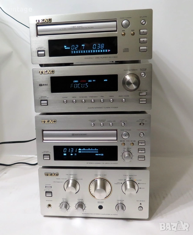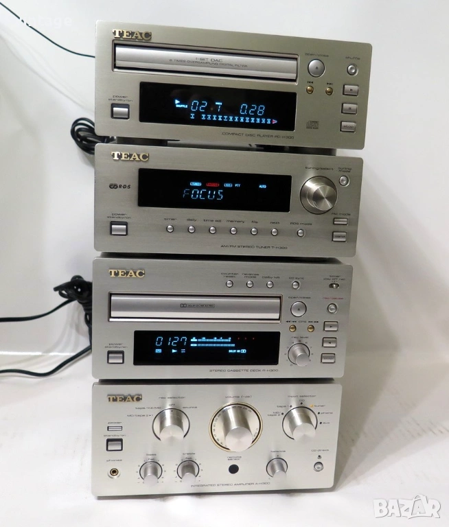 Стерео аудио система, състои се от стерео усилвател TEAC A-H300, стерео касетен дек TEAC R-H300, стерео тунер TEAC T-H300, стерео CD плеър TEAC PD-H300. Отлични технически и визуално. Дистанционно управление не е налично. Приложените снимки и видео са реални!