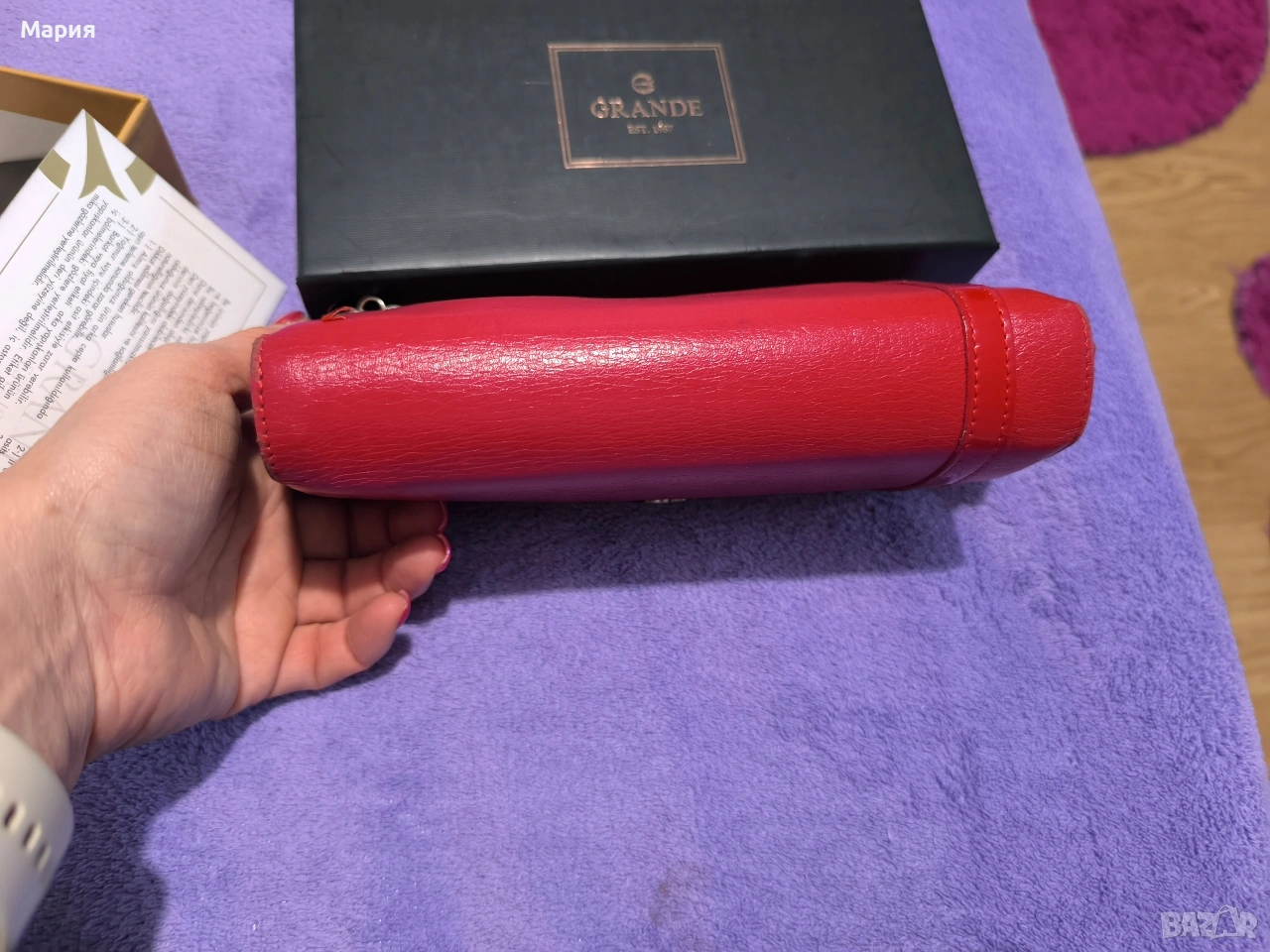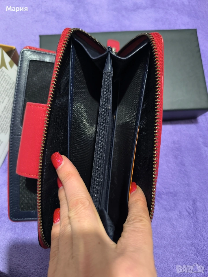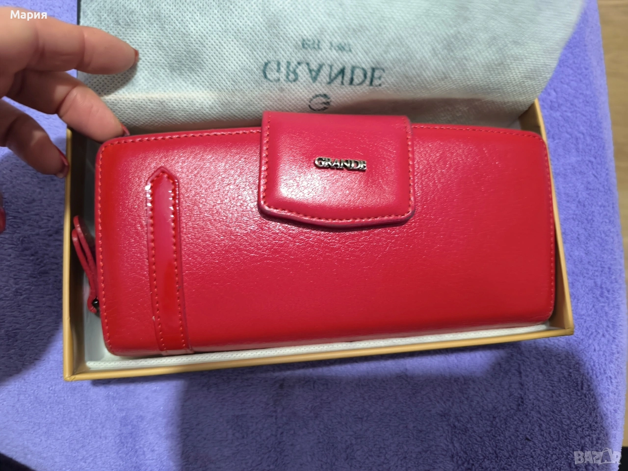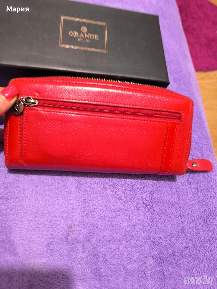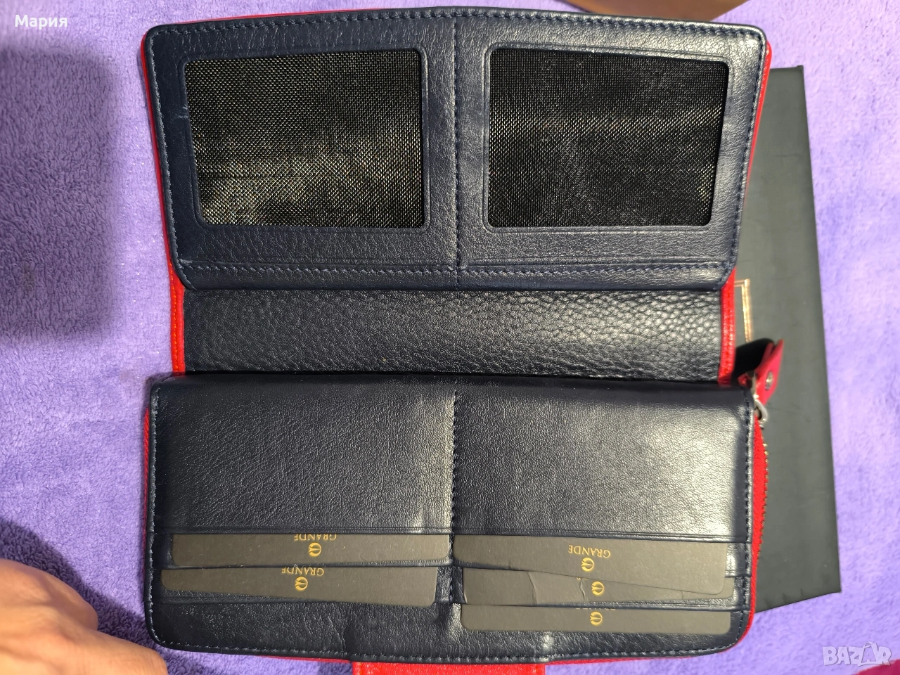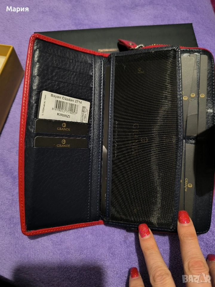 Продавам дамски портфейл от естествена кожа на турската марка Grande, тип органайзер с множество прегради. носен е много малко, повече е стоял в шкафа, затова има някои дребни забележки,които съм показала на снимките.