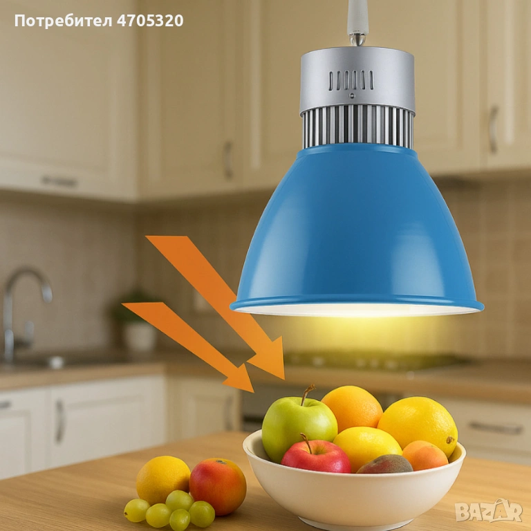 Конструкция: метален абажур с бяла рефлекторна вътрешност; горна секция с алуминиев радиатор за охлаждане