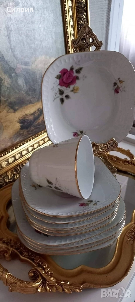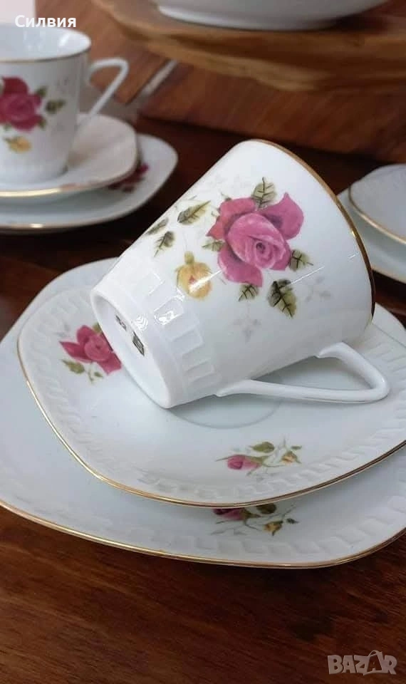 Троен сет за кафе. КОСТЕН ПОРЦЕЛАН. Вместимост 175мл. 🌹. 🌱... (¸.•¨¯`*•.🍃🌹🍃 Марка за порцелан W Wawel (Wałbrzych) Произведено в Полша. Марка на фабриката за порцелан ZPS Krzysztof/ZPS Wawel във Валбжих, използвана между 1952 и 1999 г. 🌱... (¸.•¨¯`*•.🍃🌹🍃 В наличност 5 тройни сета. Цената е обща. 🌱... (¸.•¨¯`*•.🍃🌹🍃