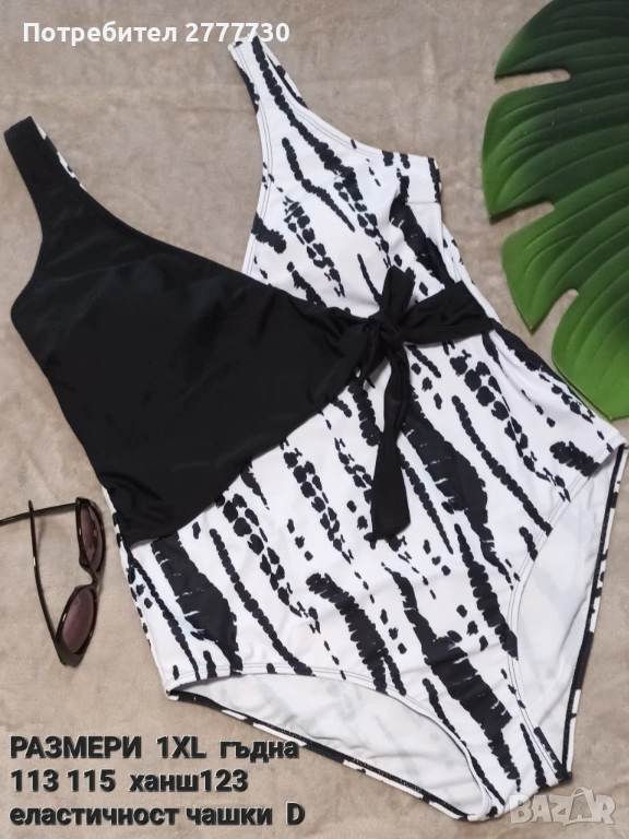 Ефектен цял бански в принт черно и бяло. Елегантен. Почуствайте комфорта. Супер материя и цена. Размери 1XL гр 113СМ ХАНШ 123СМ. Регулираща презрамка. Доставяме по Еконт и Спиди опция преглед