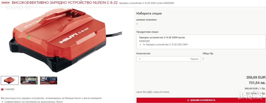 Продавам високоефектнивно и високоскоростно бързо зарядно с две охлаждания и опционален модул за данни CDM-22 на Hilti за новите батерии от Nuron серията. Зарядното е като ново и използван малко, внос от Франция. С това зарядно зареждайте всяка батерия Nuron само за 30 минути – революционното управление на топлината в зарядното устройство помага на батериите да се върнат много по-бързо до температура, подходяща за зареждане, след интензивна употреба и по-дълготрайни батерии с помощта на два вентилатора, които помагат за удължаване на живота на батерията чрез поддържане на по-стабилна температура по време на зареждане. Пращаме с опция преглед и тест с куриерска фирма еконт може и лично предаване за гр. Шумен.