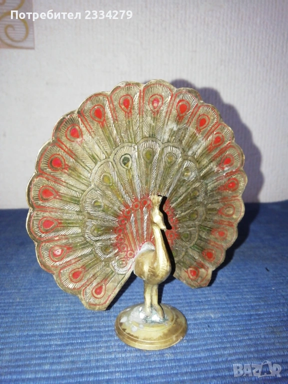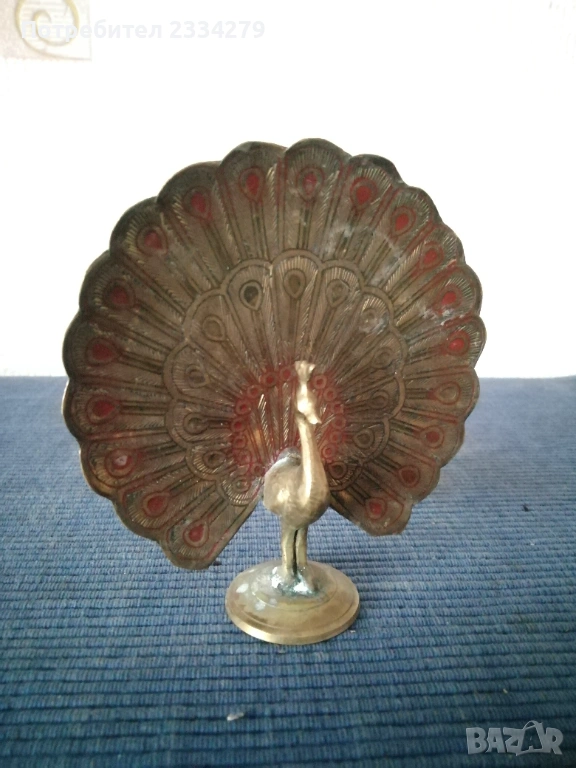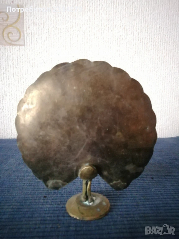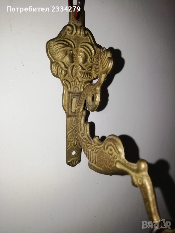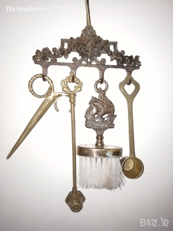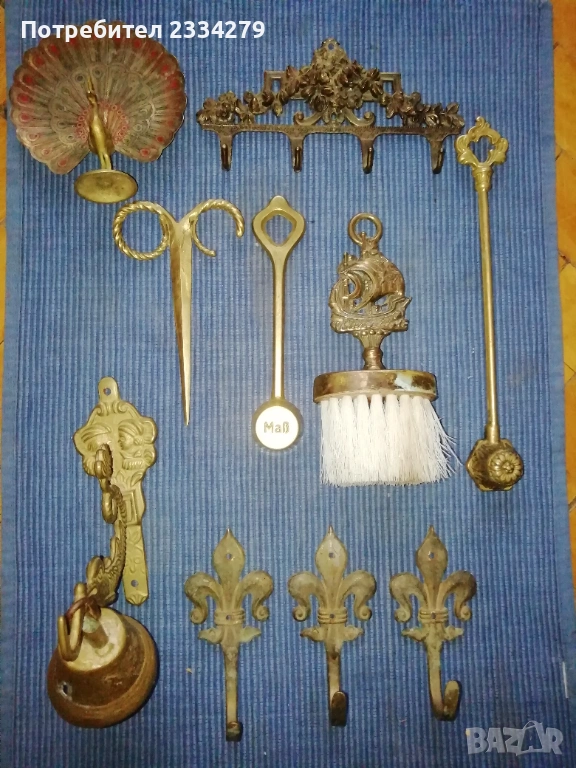 Стари бронзови предмети, сувенири. N:1 три броя стари бронзови закачалки, цена 5€.; N:2 стара бронзова камбанка с бронзова стойка на риба-дракон,размери 13х13см. цена 15€.; N:3 бронзово паунче, размери 11х10см, цена 4€.; N:4 два броя гасила за свещници, цена 8€. бройка. N:5 НЕНАЛИЧНА орнаментирана четка, .; N:6 бронзов шиш за лед,
